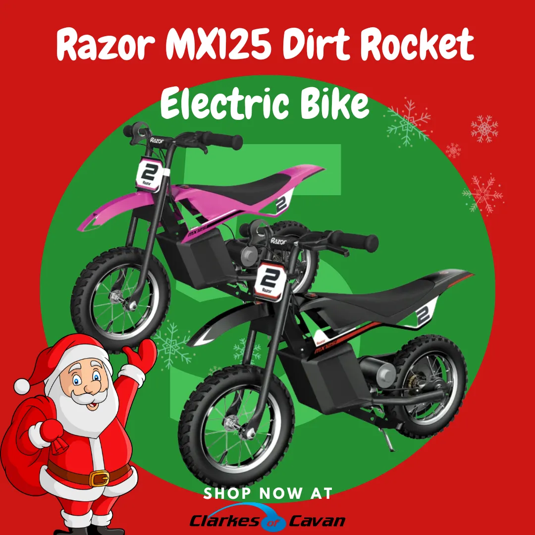 Razor's MX125 is the smallest electric dirt bike, designed for off-road confidence and performance. With authentic MX frame geometry, knobby tires, and a twist grip throttle, it provides an adrenaline-pumping introduction to off-road adventure for riders aged 7 and up.