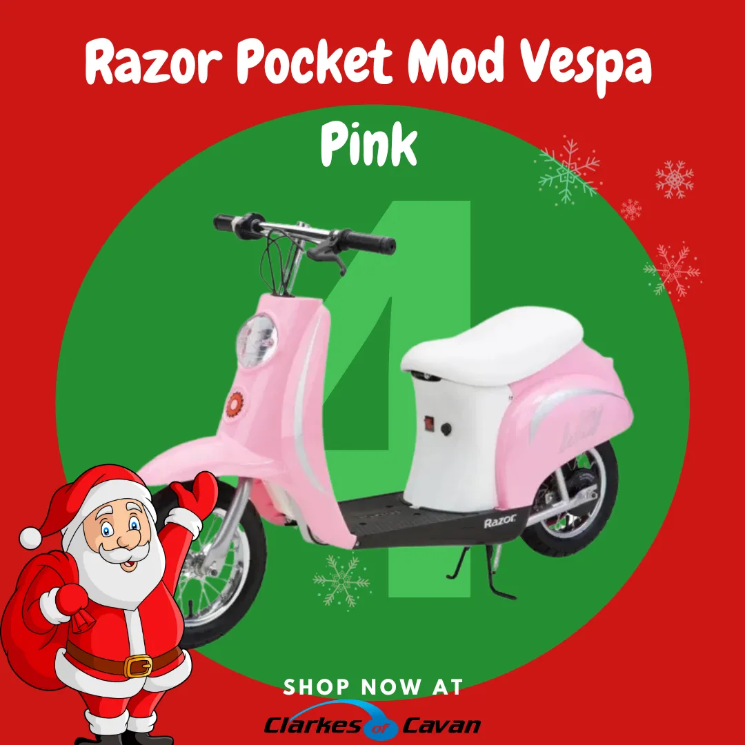 The Razor Pocket Mod Vespa Pink is a stylish and electric-powered miniature scooter designed for young riders. With its sleek pink exterior, vintage-inspired design, and a powerful electric motor, it offers a fun and fashionable way for kids to zip around in style.