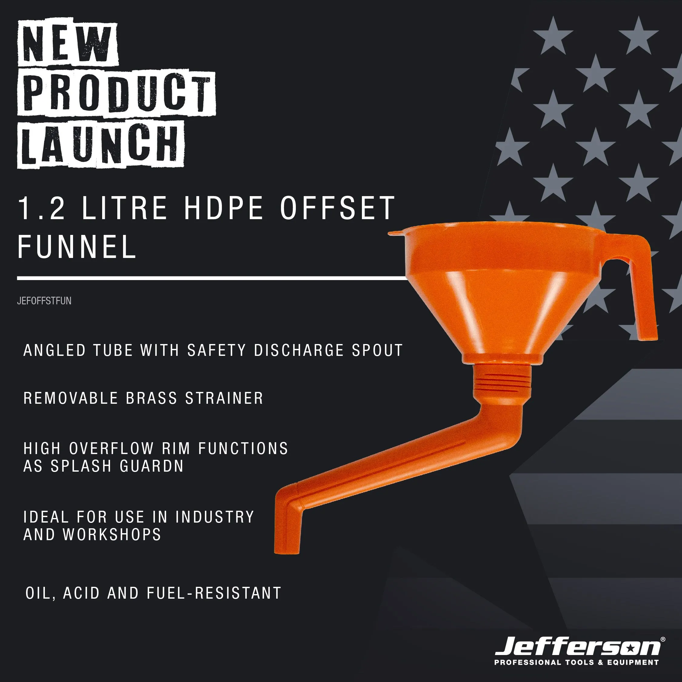 The Jefferson 1.2 Litre HDPE Offset Funnel is designed for professionals who demand efficiency and safety when handling oils, fuels, and chemicals. Its high-density polyethylene construction offers superior durability and resistance to corrosive substances, making it ideal for both industrial and workshop environments.