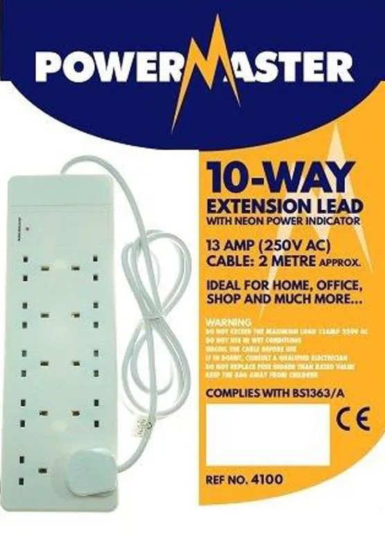 The PowerMaster 10 Gang 2 m 13 Amp Extension Lead provides a high‑capacity solution for powering multiple mains devices from a single outlet. With 10 available sockets and a robust 13A rating, it supports a wide range of plug‑in equipment. The 2 metre cable gives flexibility in positioning and is ideal for clusters of devices such as PCs, monitors, printers, AV equipment, charging hubs, or workshop tools (so long as total load remains within the 13A rating).