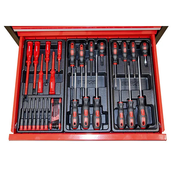 This tool chest comes fully equipped with 173 high-quality tools, including sockets, wrenches, hex keys, screwdrivers, pliers, and hammers, making it a versatile all-in-one storage and tool solution.