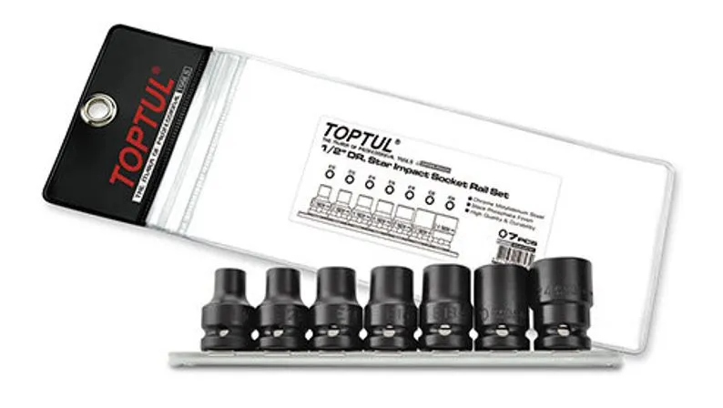 Each socket in the set is precision-engineered to provide a secure and tight fit on star fasteners, allowing for optimal torque transfer. The 1/2" drive compatibility makes this set versatile and suitable for a wide range of automotive, mechanical, and industrial applications. Whether you’re working on vehicles, machinery, or heavy equipment, the 1/2"Dr Star Impact Socket Rail Set offers the strength and performance you need to get the job done efficiently.