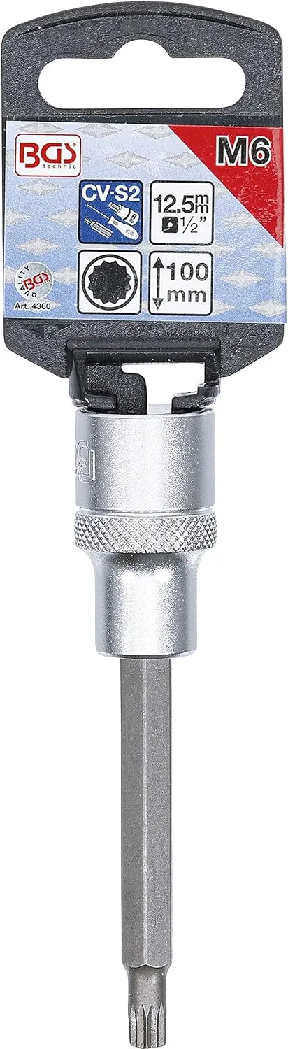 Compact yet powerful, the BGS 4360 Bit Socket is ideal for accessing M6 Spline (XZN) fasteners in tight or recessed locations. With a 100 mm length and a 1/2" drive, it’s suitable for use with standard ratchets. Built from high-grade chrome vanadium steel and finished with corrosion-resistant chrome plating, this bit socket is engineered for durability and manual control. A knurled grip zone enhances usability during hand tool applications.