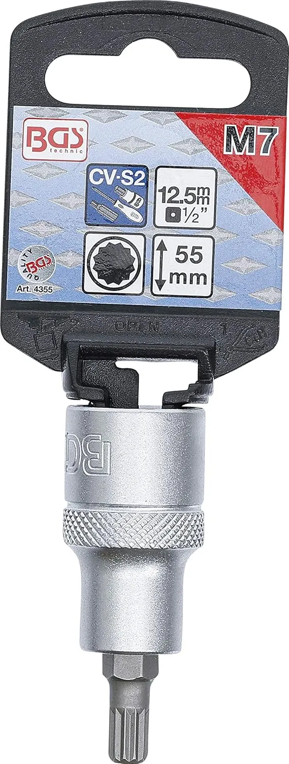 Specially designed for applications in SEAT brand vehicle seat assemblies, the BGS 4355 Bit Socket features a compact 53 mm length and M7 Spline (XZN) profile. It is made from robust chrome vanadium steel, satin chrome plated for corrosion resistance, and includes a knurled surface for improved manual control. Ideal for precision assembly and disassembly where space and accuracy are critical.