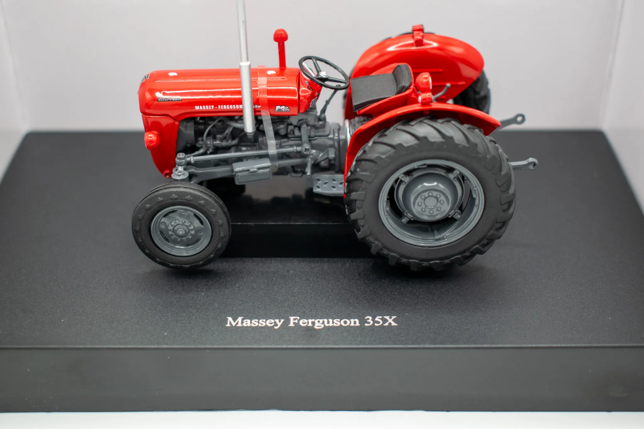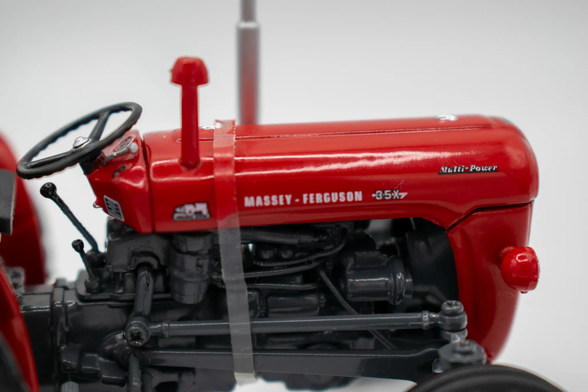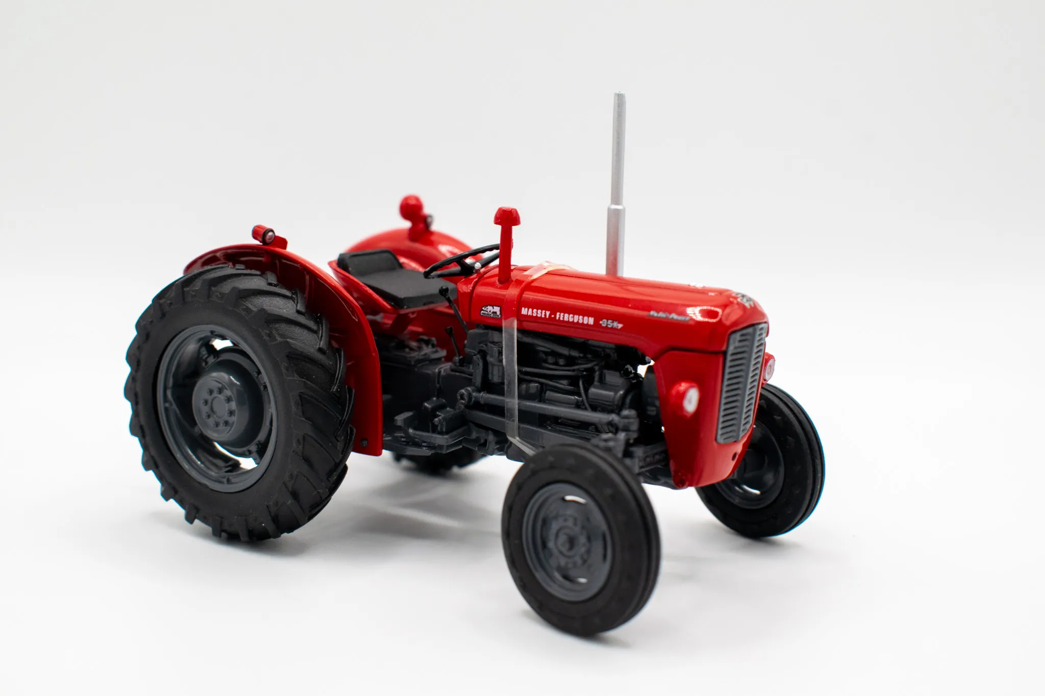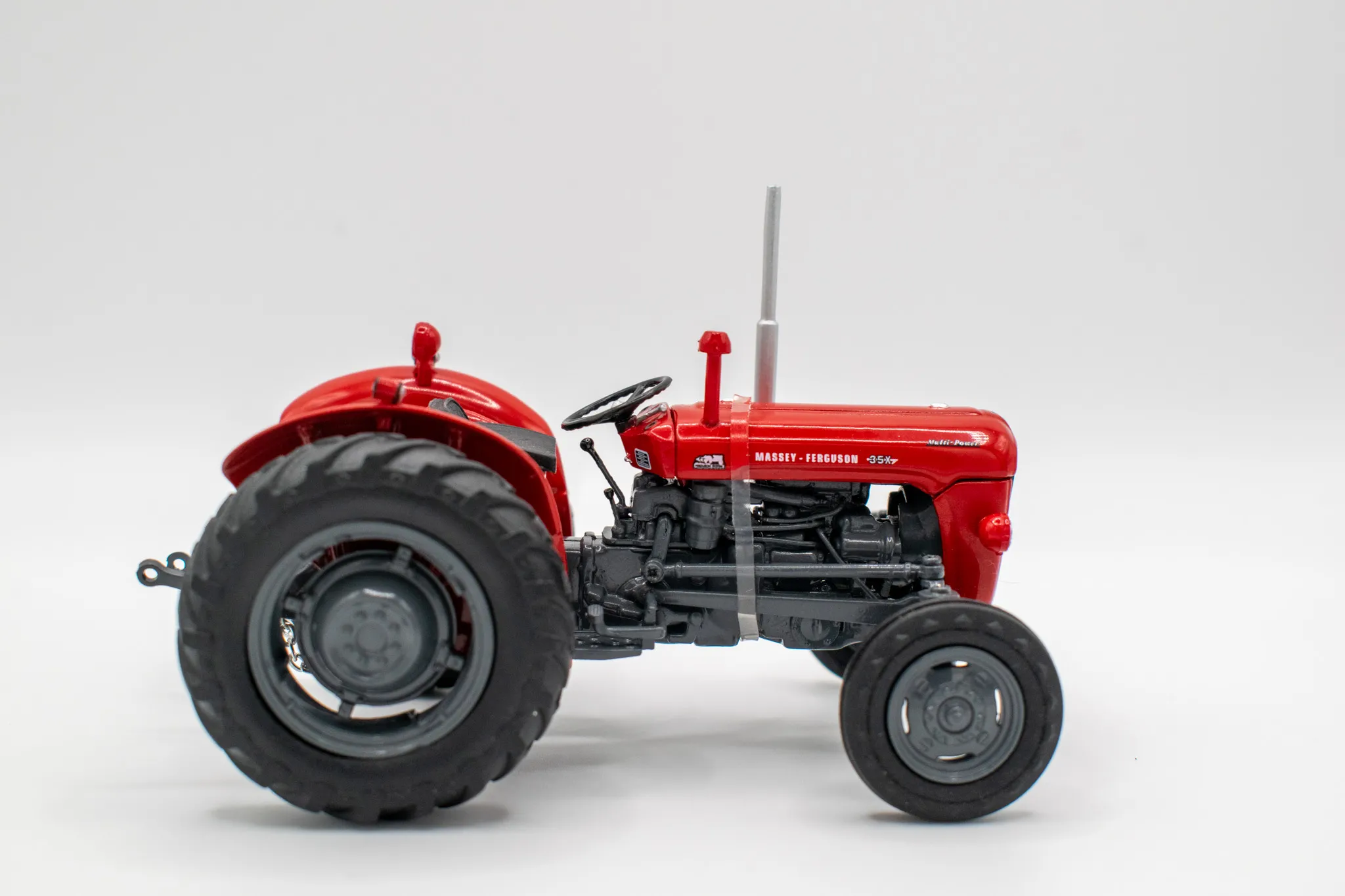 Massey Fergusson 35X vintage tractor. Includes features such as opening hood, working steering and open toolbox to the side of the engine.