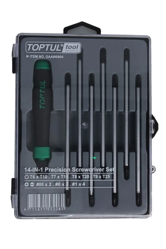The TOPTUL GAAW0804 is a versatile 8-piece screwdriver set featuring 14 interchangeable tips, perfect for professionals needing reliability and flexibility in one compact case. Manufactured using SNCM+V alloy steel, this set delivers top-tier durability and performance for general service, electronics, mechanical, and precision work.