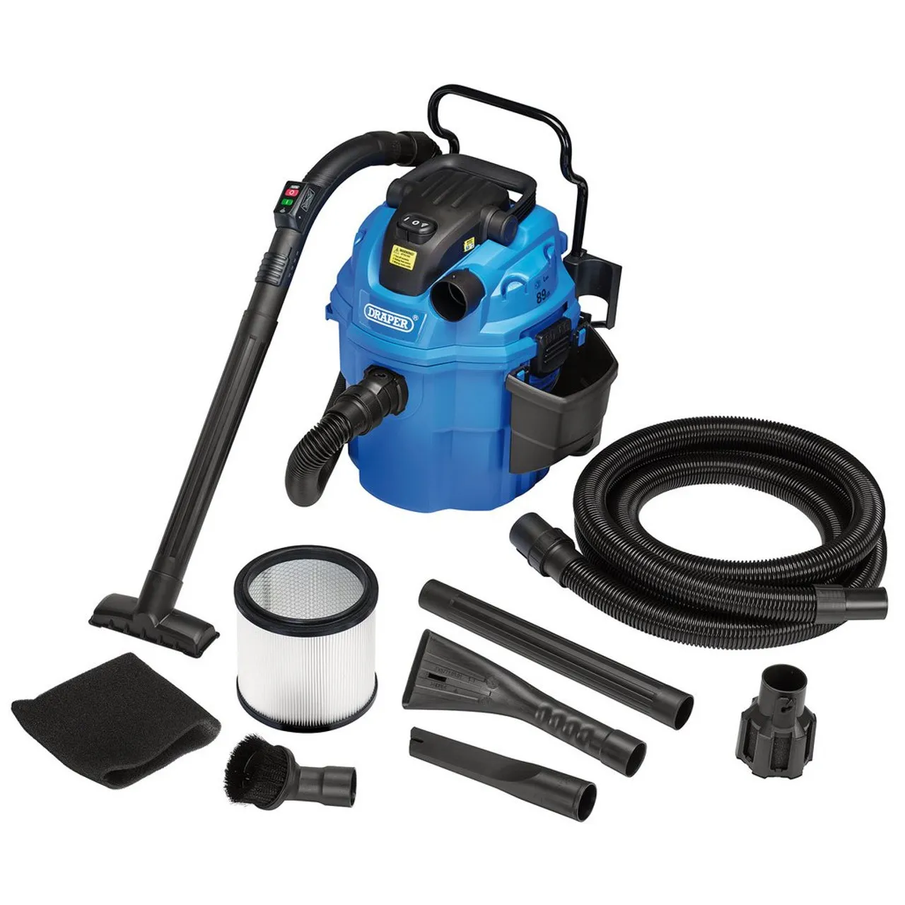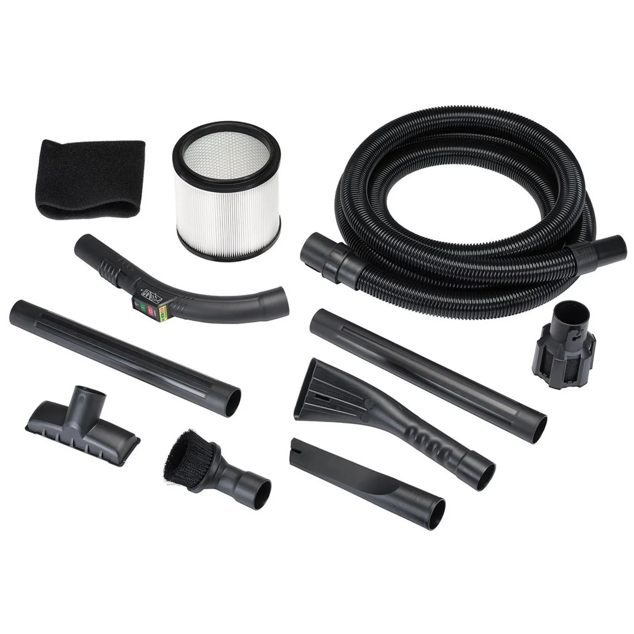 This wet and dry vacuum cleaner is wall-mountable and comes with an easy-to-install mounting rack. It can be used while mounted and is simple to remove and replace. Equipped with a powerful blower function, it effectively blows away debris. The vacuum features a 18L max capacity tank and a 10L tank for wet cleanup, along with a power rating of 1500W, allowing it to efficiently handle a wide range of materials, including spills, dust, sawdust, mud, and thick sludge. For added convenience, the vacuum includes a remote control integrated into the hand grip. It also has onboard storage for its extensive range of 42mm accessories, which include hoses of various lengths, a crevice nozzle, an upholstery brush, and filters. The remote control operates using a 12V 23A alkaline battery (sold separately).