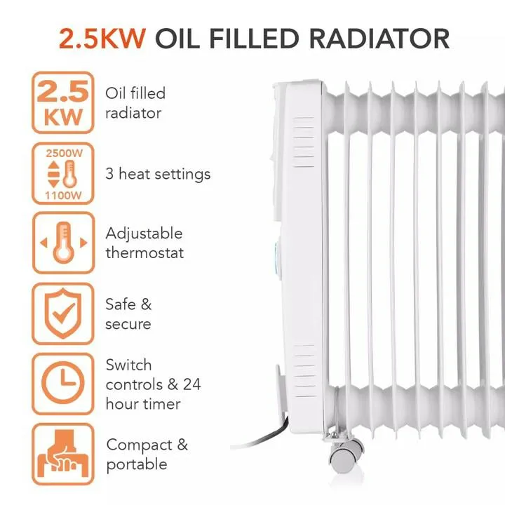 Equipped with three heat settings—1000W, 1500W, and 2500W—this oil-filled radiator allows you to control your environment and energy use. The adjustable thermostat keeps the room at your desired temperature without unnecessary power consumption.