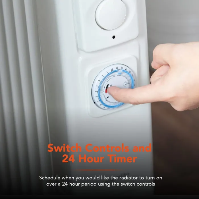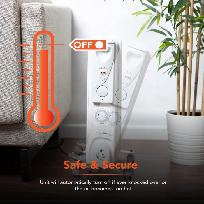 Designed with a convenient 24-hour timer, this radiator allows you to program heating schedules, making it possible to warm up spaces before use and manage energy usage efficiently. Safety is a priority with the Warmlite radiator, which includes overheat protection and a tip-over switch that automatically turns off the unit if it overheats or is accidentally knocked over.