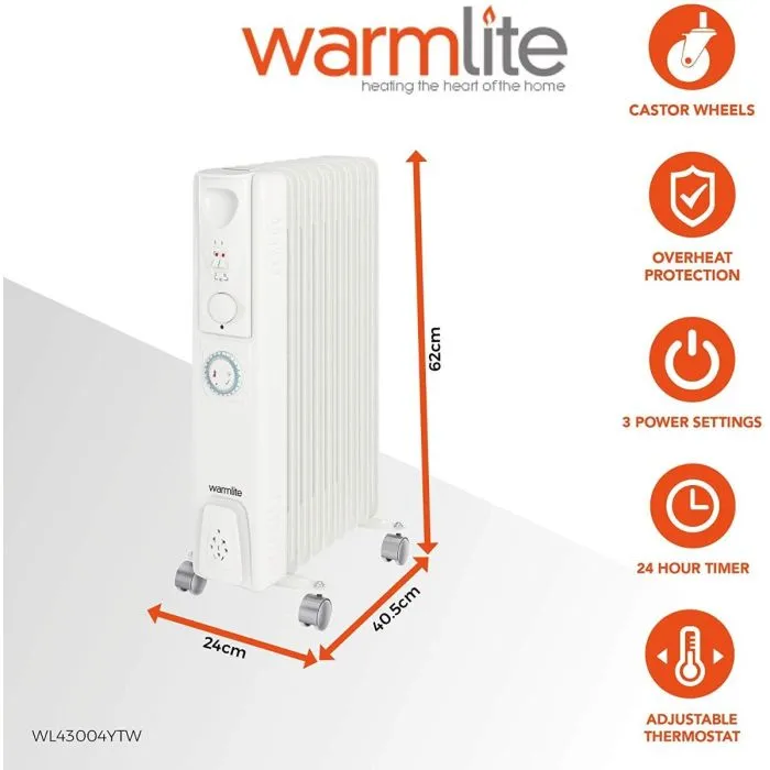 This Warmlite 2000W Oil Filled Radiator is an efficient heating solution for home or office use. With a 24-hour timer, safety features, and portable design, it’s built for user convenience and energy-conscious operation, providing warmth and comfort all winter long.