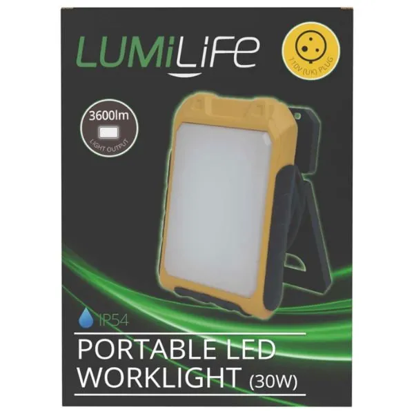 The LUMILIFE 30W LED Portable Worklight (S30472) offers a top‑tier luminous output combined with energy efficiency and portable convenience. With a 3,600 lumen output and cool daylight colour temperature (6,500 K), it ensures exceptional visibility for detailed work environments. The unit is mains powered (110 V UK plug fitted), and built to handle dust and splashes (IP54 rating). Specs show dimensions approximately 169 mm wide × 232 mm high × 87 mm deep.