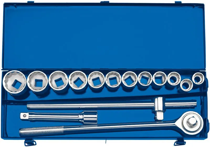 Socket set manufactured from carbon steel hardened and tempered with a polished finish. Packed in metal carrying case.