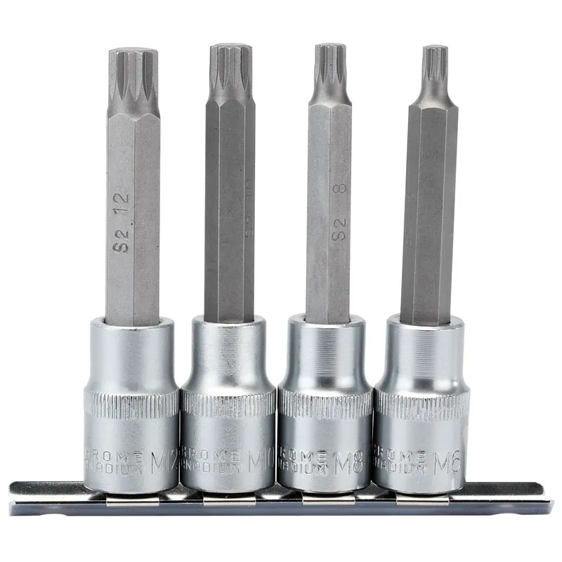 Expert Quality, 4 Spline socket bits, 100mm long. All sockets manufactured from hardened and tempered chrome vanadium steel with sand blasted bits of S2 silicon steel. Each socket has a knurled ring for extra grip. Supplied on a steel socket retaining rail. Display packed.