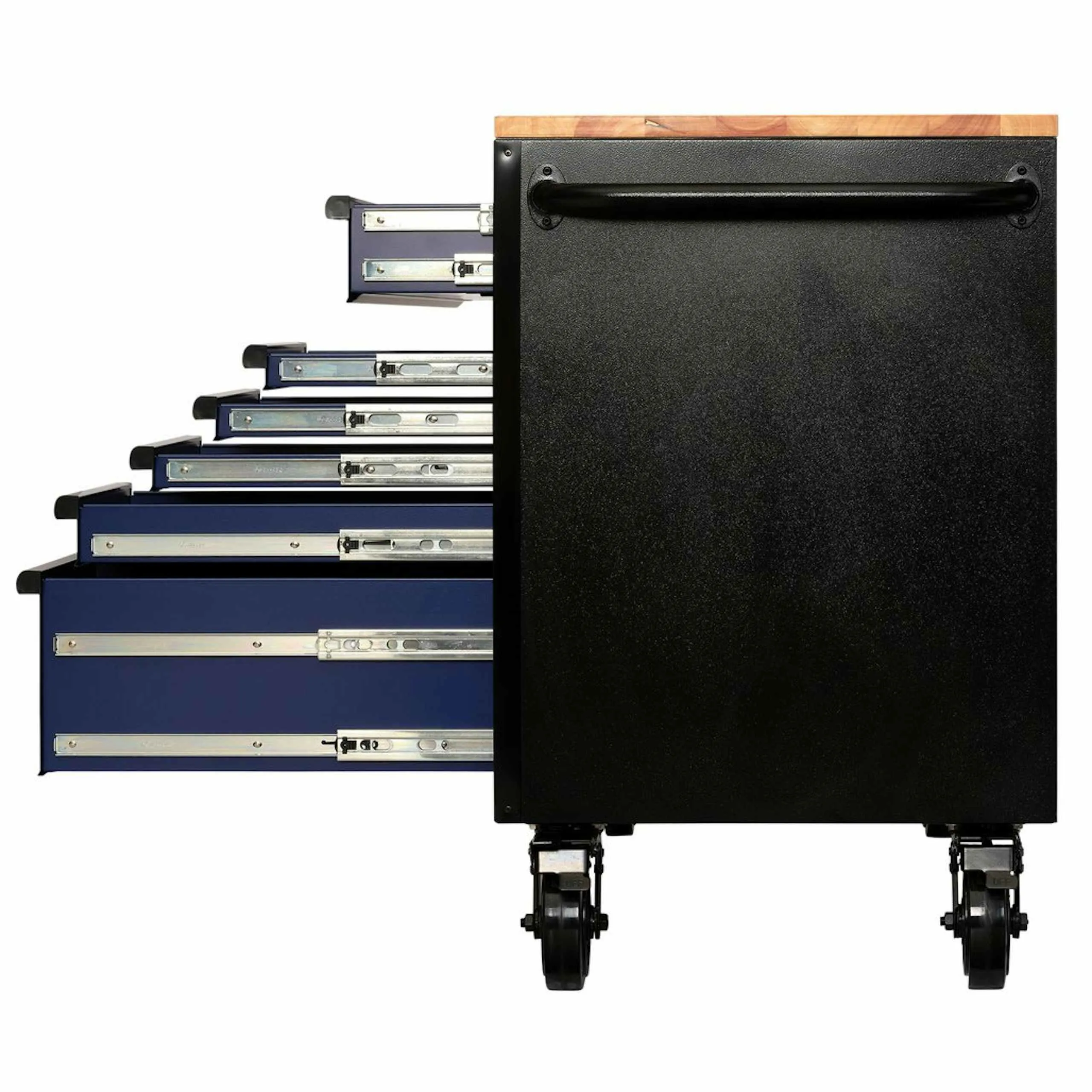 Each drawer is equipped with a smooth, soft-close mechanism and EVA foam lining to protect your tools when not in use. Designed with mobility in mind, the 56 inch tool box includes a sturdy steel handle and four heavy-duty caster wheels, allowing you to move it easily between work areas while keeping your tools within reach. For added security, it’s fitted with an integral lock and two keys.