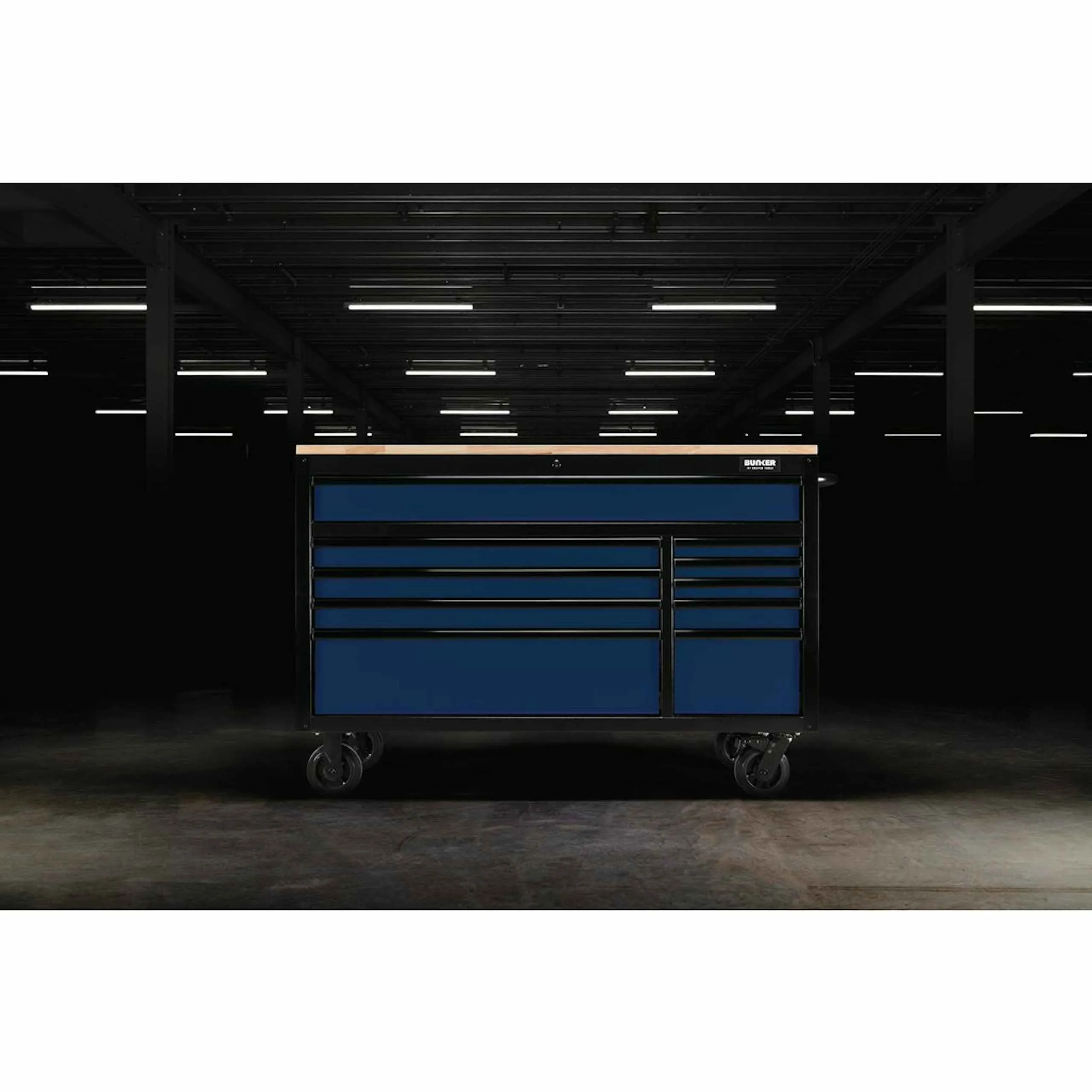 The 56"" BUNKER 10-drawer workbench roller tool cabinet, available in blue, grey, or green, is designed for optimal tool storage. Ideal for both home and work environments, it features a matt-textured protective finish to resist scratches and wear, ten drawers, and a sleek black anodised aluminium trim.