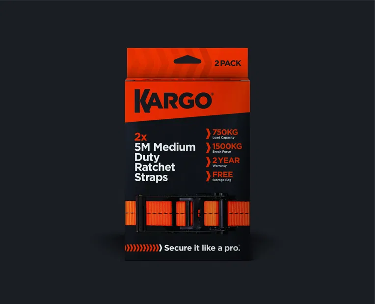 Designed for safety and everyday use, the Kargo medium duty ratchet strap 2 pack is ideal for securing medium to heavy loads. Each strap features high-strength 35mm polyester webbing, welded steel claw hooks, and a load capacity of 750kg (with a break force of 1500kg). The anti-corrosion coated components ensure durability in tough environments.