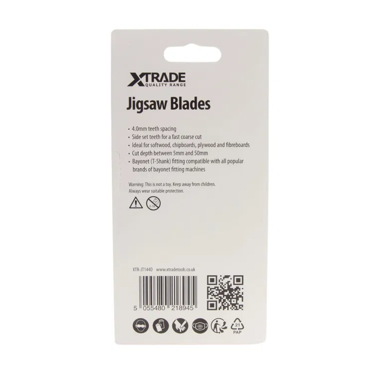 The XTRADE JT144D jigsaw blade wood set is built for speed and performance. Designed with side-set teeth and made from durable CrV steel, these 100mm blades cut quickly through softwood, plywood, chipboard, and fibreboard. Ideal for tradespeople and DIY users who need clean, efficient results on thick wood.