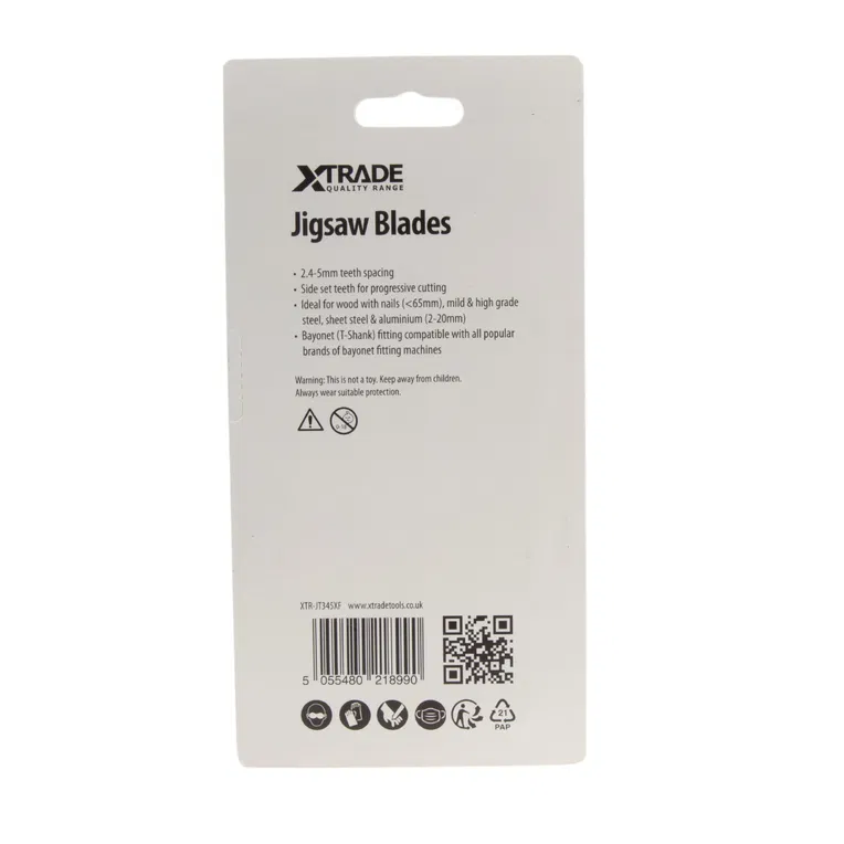 The XTRADE JT345XF jigsaw blade set is designed for versatile, multi-material cutting. Featuring progressive side-set teeth and bi-metal construction, these blades handle wood with nails, plastics, aluminium, and steel with speed and durability. Ideal for trade use, DIY, and workshop projects.