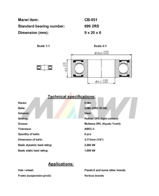 The 699 2RS cartridge bearing (CB-051) is a high-quality sealed ball bearing built for precision, strength, and long-lasting performance. With dimensions of 9mm (inner) x 20mm (outer) x 6mm (width), this bearing is widely used in mechanical applications requiring smooth, efficient rotation with minimal friction.