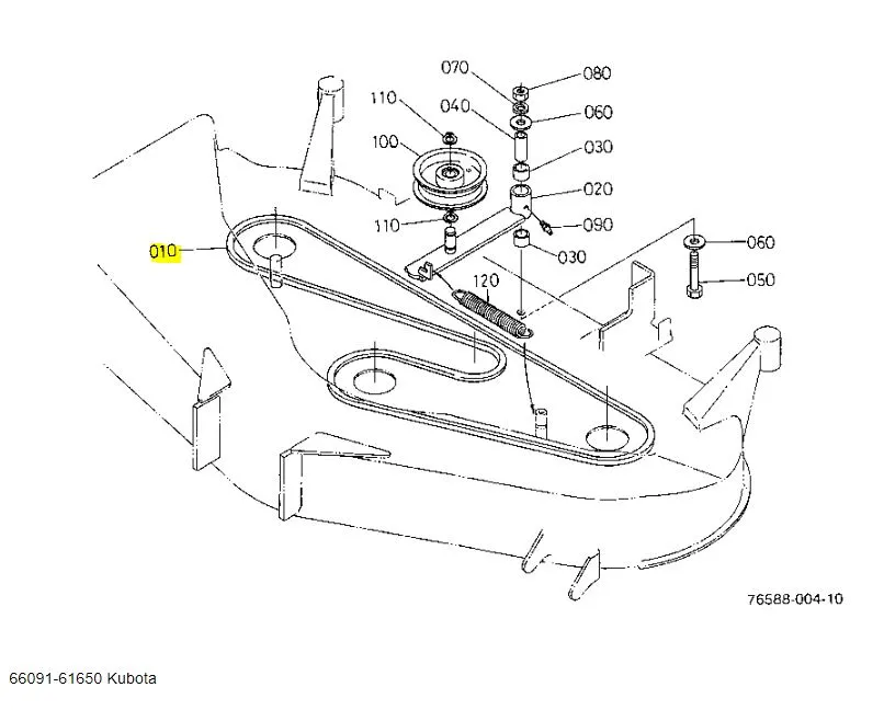 The Kubota 66091-61650 V-Belt is an essential component of the RC44LT mower deck's tension pulley system, specifically designed for Kubota T1600H and T1600 lawn tractors. This OEM replacement belt guarantees a perfect fit, superior performance, and increased durability compared to aftermarket alternatives.