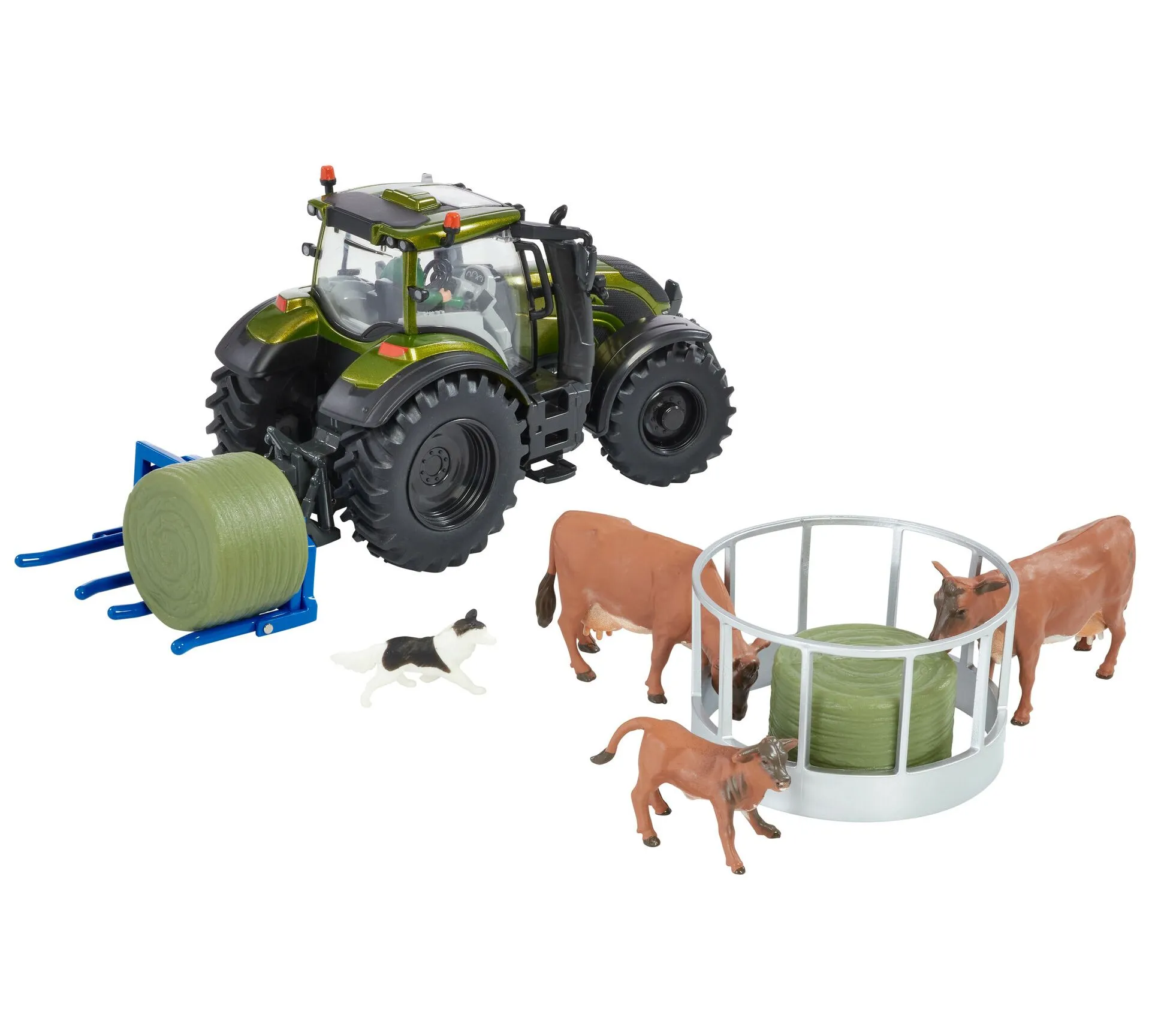 Complete Set: Includes a Metallic Olive Green Valtra tractor, cow feeder, and bale lifter.