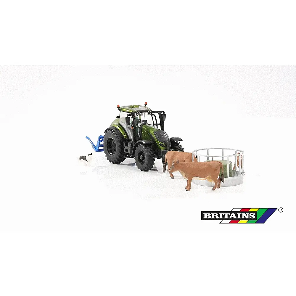 The Britains 43323: Metallic Olive Green Valtra Playset is a premium 1:32 scale farm model set that brings together a striking Valtra tractor, a functional cow feeder, and a bale lifter. This set is an excellent addition for collectors and young farm enthusiasts who want to create realistic farm scenes.