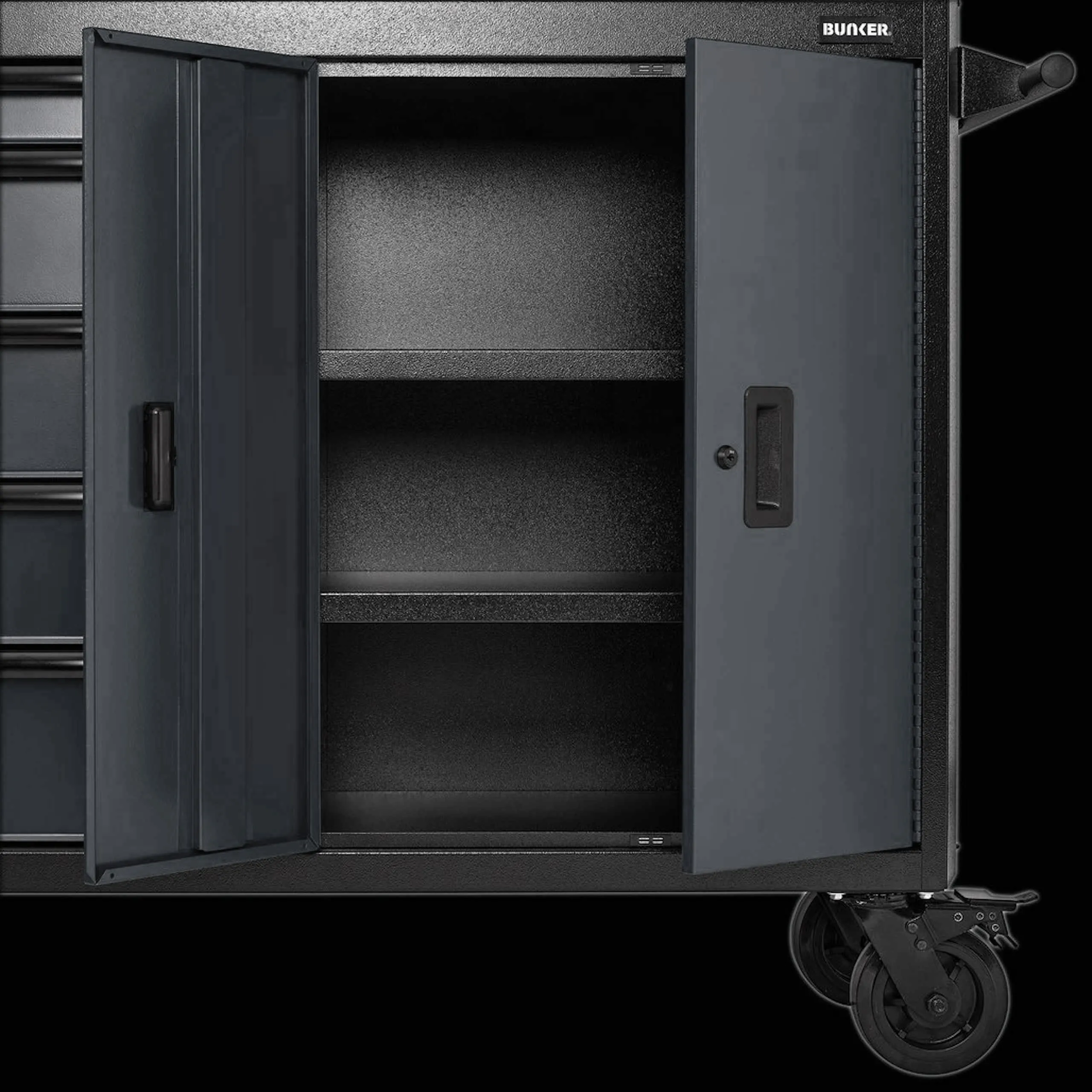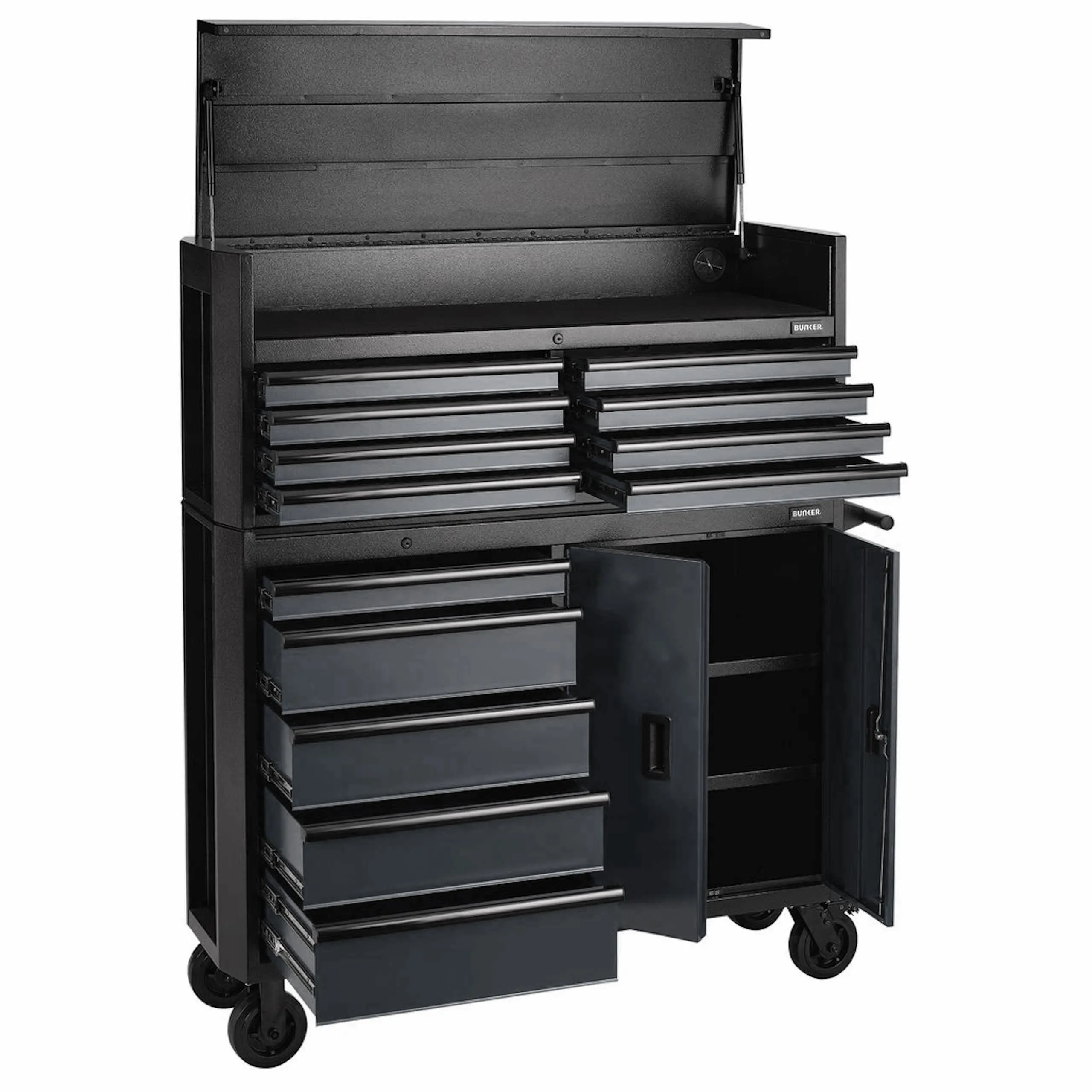 Enhance the form and function of your garage or workshop with the 52" BUNKER combined roller cabinet and tool chest. Available in blue, green, black or grey, this durable unit seamlessly blends style with exceptional functionality. Made from high-quality steel and finished with an industrial powder coating and black anodised aluminium trim, it is built to last.