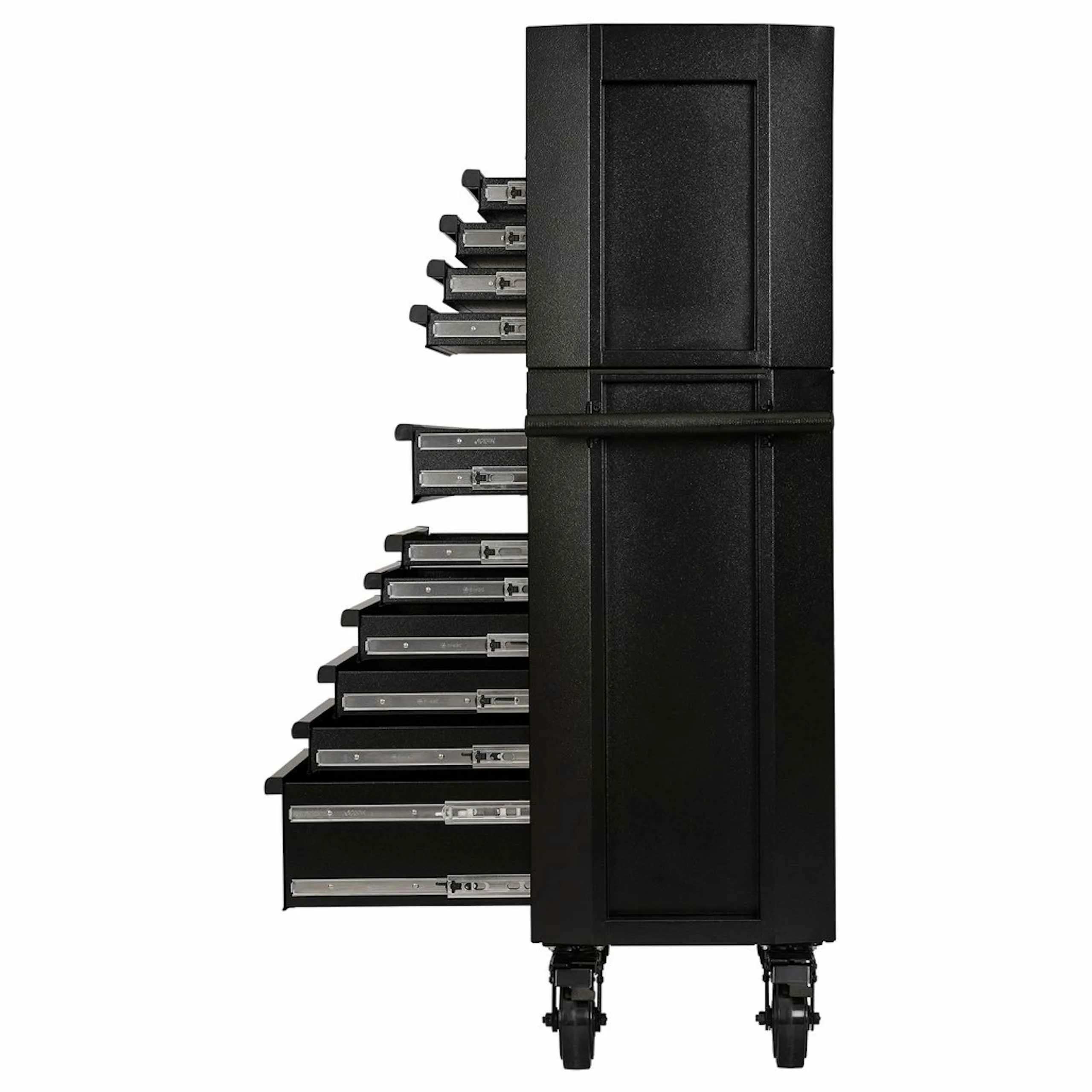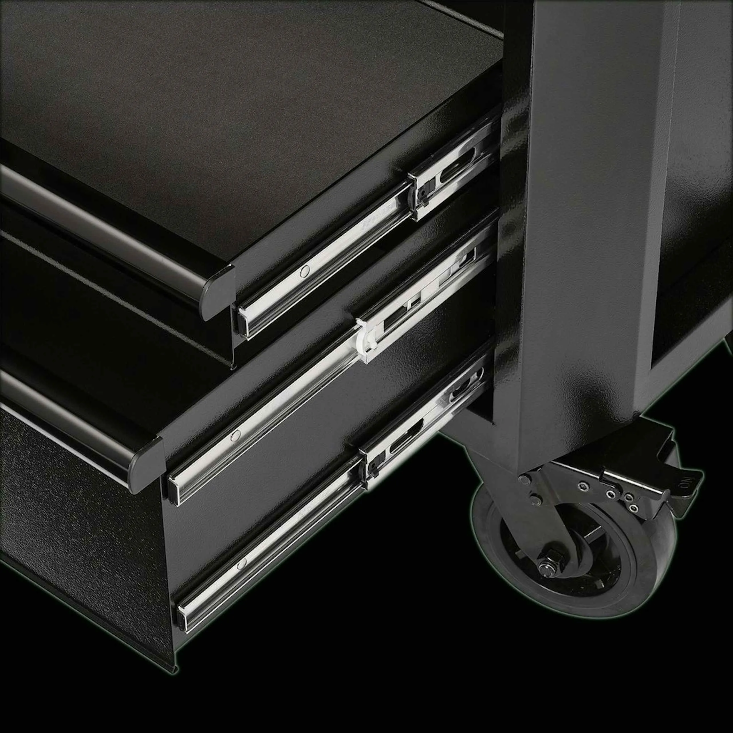 The unit features 25 soft-close drawers lined with protective foam to keep your tools safe and secure. The tool chest lid operates smoothly with gas struts for effortless access, while dual rubber grommets provide convenient cable management.