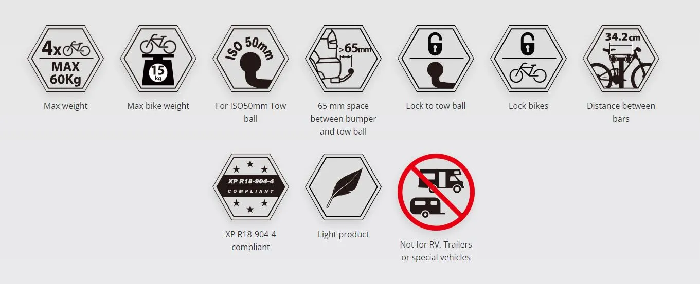 Mounting: Fits 50mm tow ball (requires 65mm clearance)