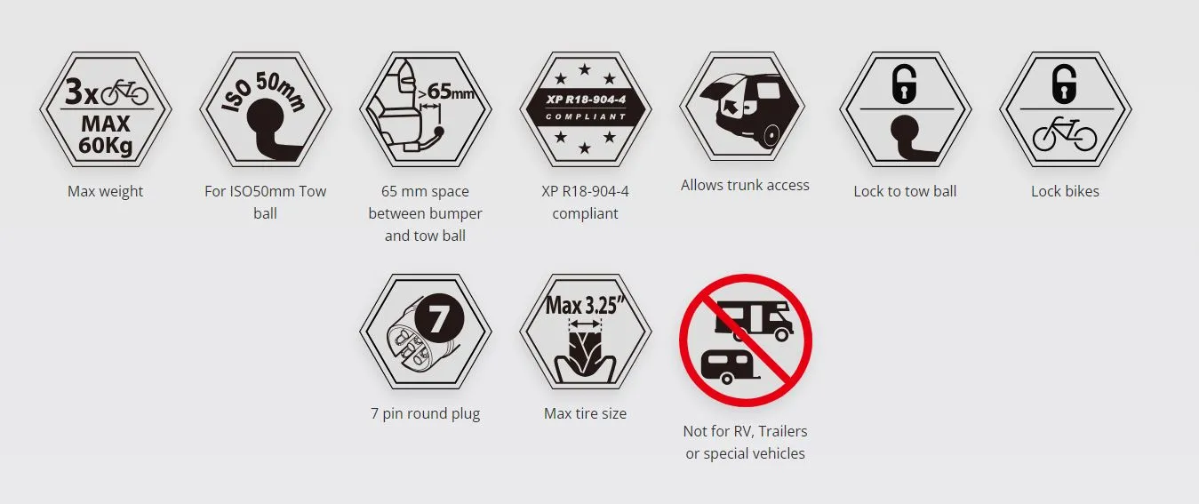 Tool-free fitting to standard 50mm tow balls with Buzzrack’s patented conical system.