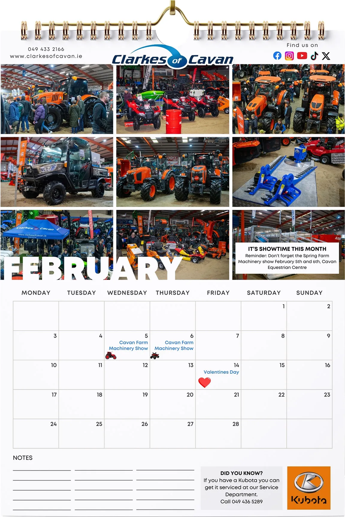 Grab the new Clarkes of Cavan 2025 Calendar A3 Size. Available Now. This meticulously crafted calendar is more than just a date tracker; it's a visual journey through the world of our biggest brands, featuring stunning images from Kubota, Honda, Stella, and our diverse range of Bikes and Kids Toys.