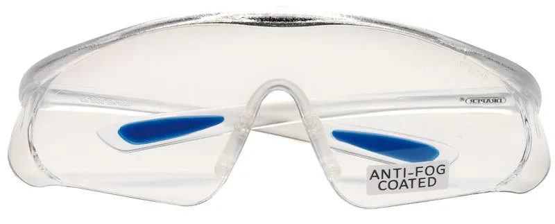 Lightweight safety glasses with clear polycarbonate wrap-around anti-scratch and anti-fog lens. Fitted with a soft rubber nose piece and rubber-tipped arms achieving a secure and comfortable fit.