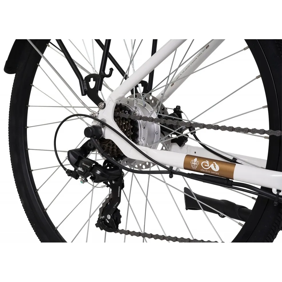 The bike comes fully equipped with full-length mudguards, a rear rack, and a big-foot kickstand, making it ready for everyday use. With Shimano 21-speed gears and mechanical disc brakes, the Mojav-E ensures a safe, comfortable, and practical ride wherever your journey takes you.