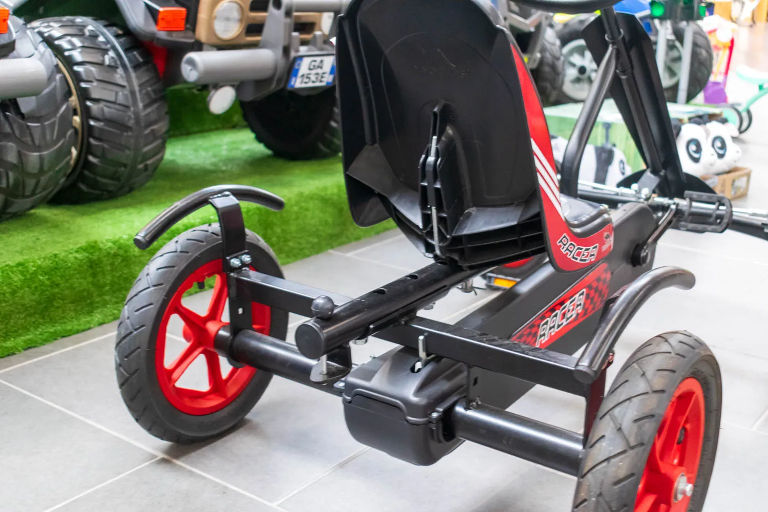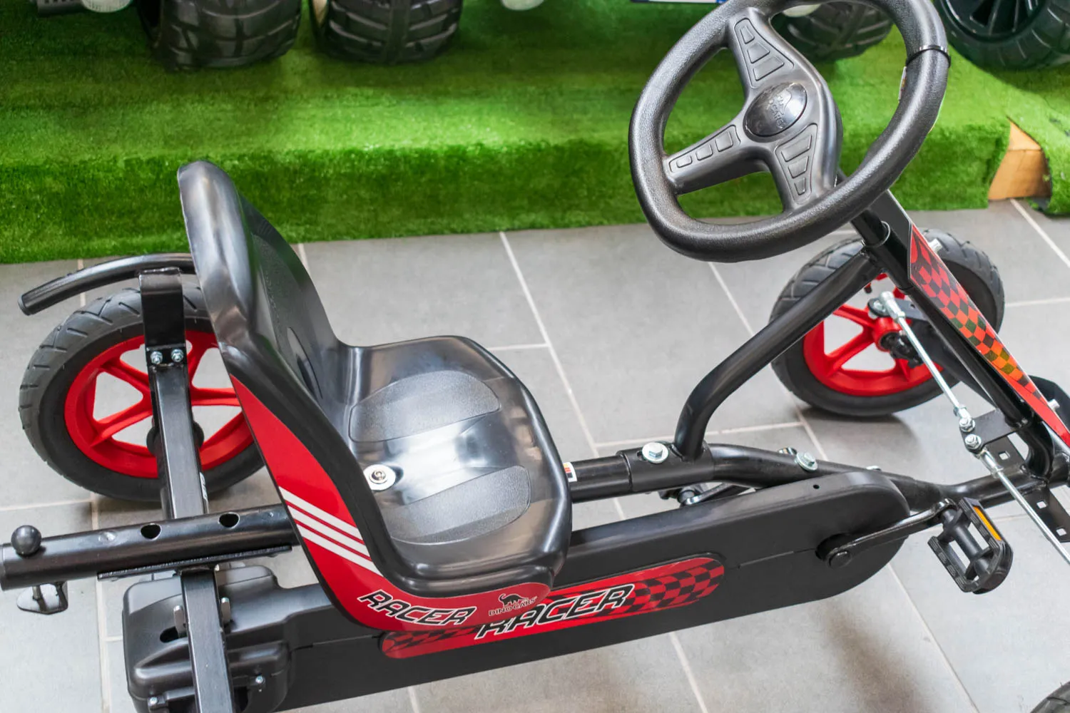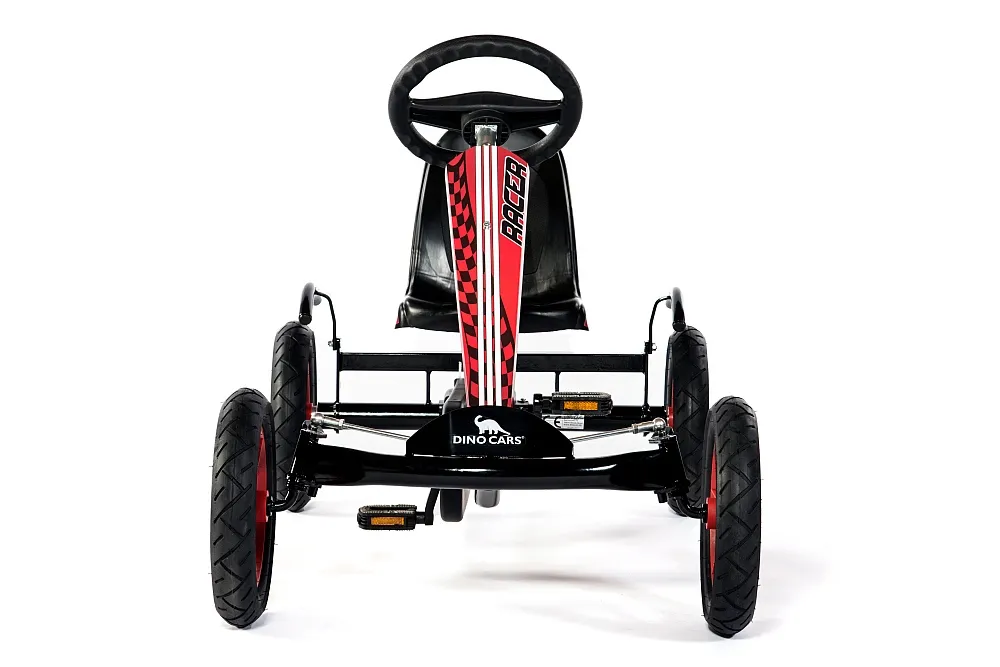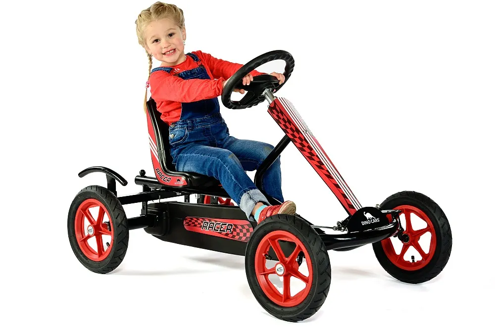 DINO CARS - Kids Line - Speedy BF1 black / red Go-kart With this kart you are always very far ahead. The Dino Cars Speedy BF1 in black / red brings you quickly to your friends. The smallest DINO CARS model is extremely stable and at the same time runs extremely light thanks to pneumatic tires with integrated inner tubes and narrow wire rims. The wheels have ball-bearings. The highlight of this go-karts is the built-in brake freewheel with coaster brake The BF1 prevents the pedals from turning while driving forward. The drivers can take breaks during the forward movement. This minimizes the risk of injury. To reverse, you slow down the go-kart with backpedal brake until the kart stands still. Afterwards you kick the pedals backwards. The reverse gear is now automatically engaged. That's pure driving pleasure. A go-kart for children from 3 to 9 years - the Speedy BF1 is growing This go-kart always grows with you, because the DINO CARS Speedy BF-1 Go-kart in black / red offers a 4-point seat adjustment. Simply lift the seat and put it in the desired position. It does not need a tool for that. The Speedy is powder coated and therefore compensates for minor impacts without damages. The DINO CARS Speedy BF1 is highly recommended Many kids are excited and the parents appreciate the quality and safety. As an accessory, even a front lifting device can be mounted with a shovel. There is also an extra seat for the sibling and a trailer for large transports available.