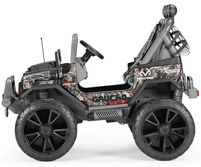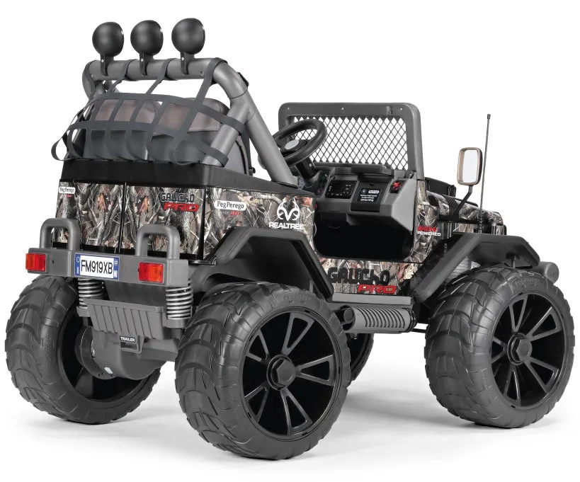 Drive Like A Pro!Ready to take the fun to the next level? Gaucho Pro Realtree™ is a powerful off-road vehicle with a rechargeable 24Volt/12Ah/300Wh battery ready to tackle every adventure! No hassle, just plenty of advantages:SUPERIOR, PROFESSIONAL-LEVEL PERFORMANCE on any terrain thanks to the extreme traction wheels.LOW NOISE, SUPERIOR POWER with 2 quiet 420W engines (840W total) that move the toy like a real low-noise electric car.ENDLESS FUN EVEN ON DIRT TRACKS! Overcoming obstacles is its talent. The four-fold engine torque makes it easy to tackle obstacles by travelling up slopes of up to 17%, always at full power and at a top speed of 12 km/h. Age 6+.