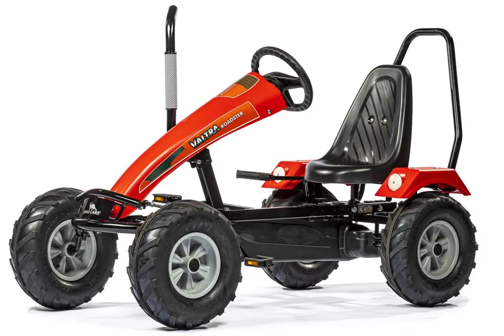 Farmers welcome! The VALTRA BF1 with tractor style tires is your ideal working pedal cart for the farm. This go-cart by DINO CARS in VALTRA design makes the hearts of small and large farmers beat faster. Equipped with the bonnet in original VALTRA colours, floating front axle, exhaust pipe, ball-point steering and 6-point seat adjustment, the VALTRA BF1 is in no way inferior to its big role models in terms of efficiency and reliability. Your VALTRA BF1 is already equipped as standard with a roll bar. Thanks to the built-in trailer coupling you are well prepared for any work on the field.