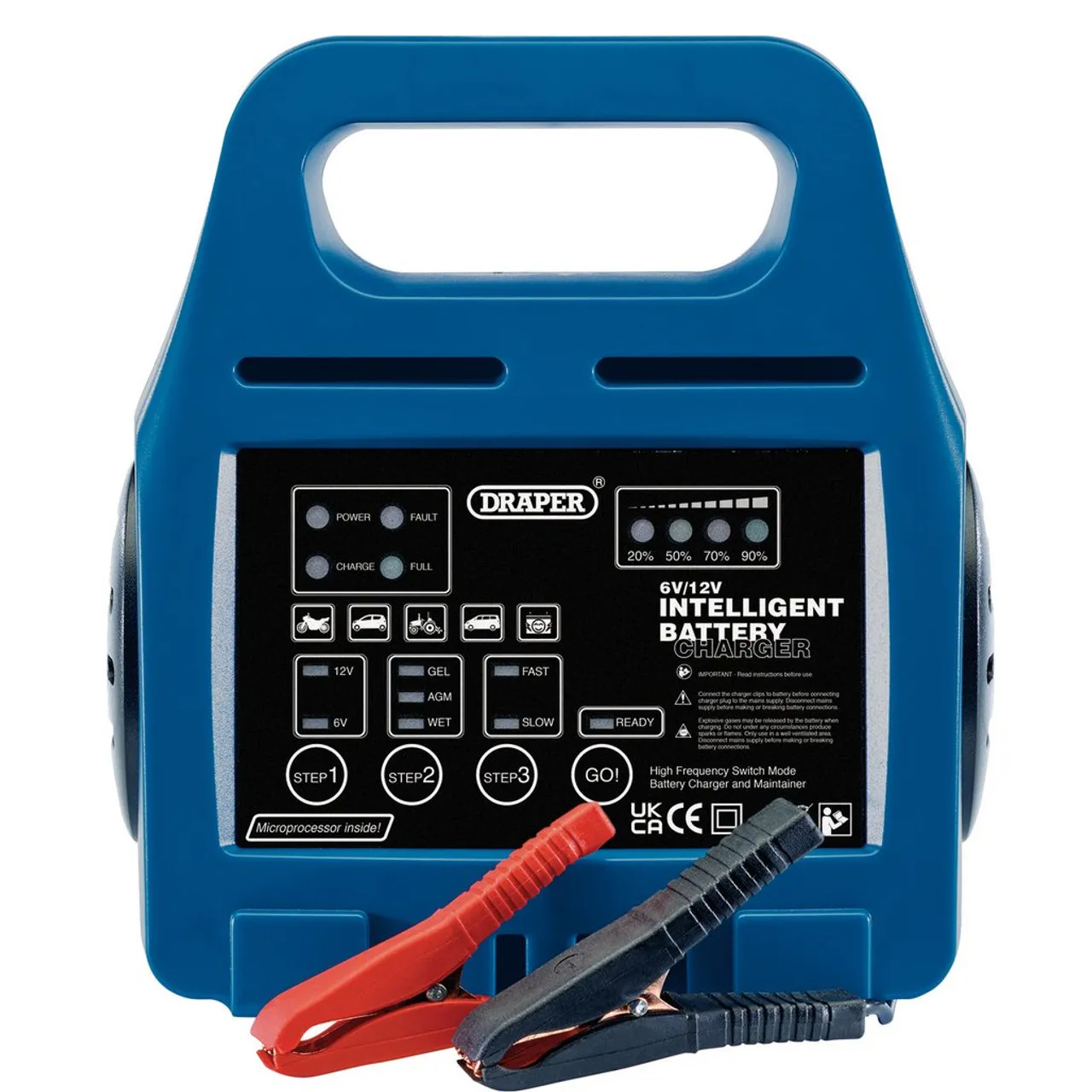 The Draper 6/12V Intelligent Battery Charger (33861) is designed for both workshop and home use. It features fully automatic high-frequency technology with continuous adjustment for unsupervised charging. Suitable for wet, AGM, and gel batteries between 40Ah and 160Ah, this microprocessor-controlled charger ensures safe and efficient charging.