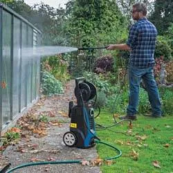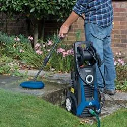 PRESSURE WASHER WITH TOTAL STOP FEATURE (2200W). Portable pressure washer for domestic use, ensures efficient cleaning of vehicles, caravans, motor vans, driveways, boats etc. The total stop valve automatically activates and deactivates the high pressure cleaner every time the trigger is operated, which increases the life of the motor and reduces electricity consumption. Supplied and fitted with 5M of high-pressure hose, gun, lance, pin for cleaning nozzle, patio lance, fixed brush, angle nozzle and turbo nozzle. Display packed.