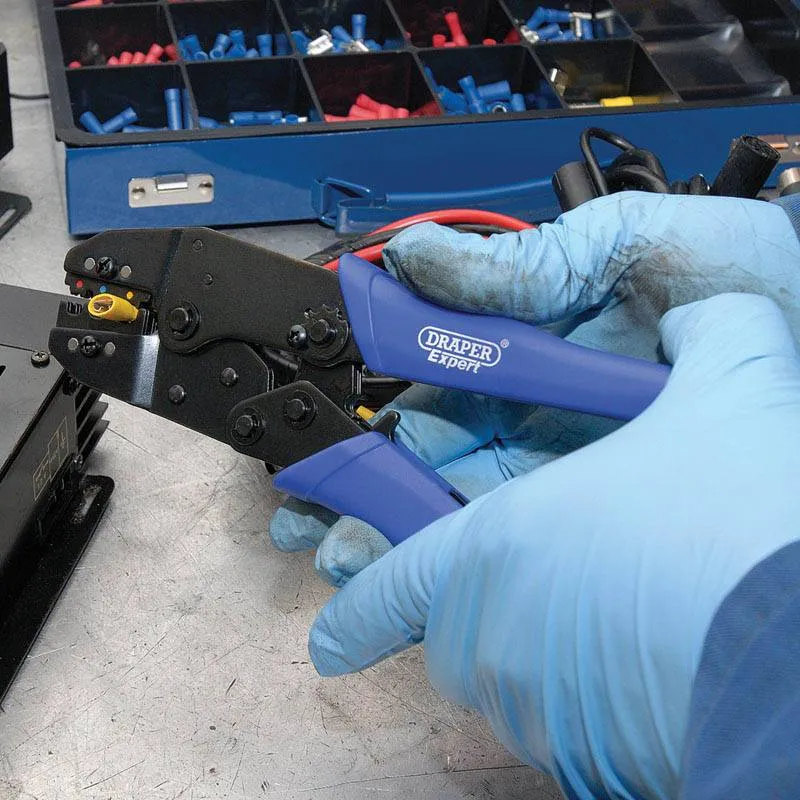 Expert Quality, carbon steel with hardened and tempered jaws. Continuous crimping at preset tension ensures accurate crimp. Chemically blacked finish with PVC grips. Suitable for crimping insulated terminals as follows:- red channel: 0.5-1.00mm², blue channel: 1.5-2.5mm² and yellow channel: 4.0-6.0mm². Supplied with 590 (approx.) mixed pre-insulated terminals in a steel storage case with insert.