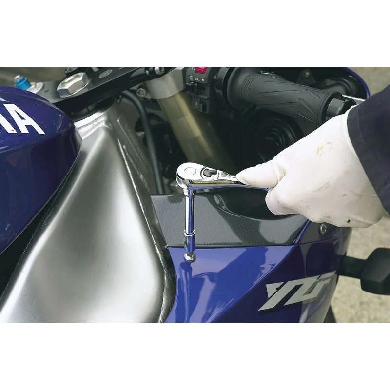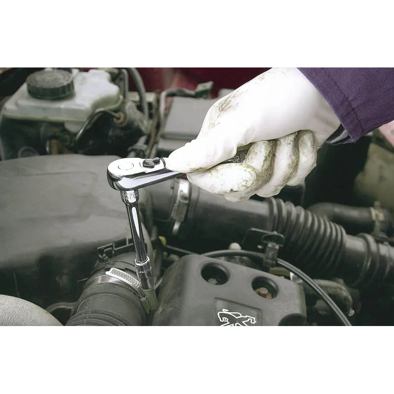 Manufactured and tested generally in accordance with DIN3122 and ISO3315 Specifications Expert Quality, body forged from chrome vanadium steel hardened, tempered, chrome plated and polished for corrosion protection. 45 tooth ratchet, 140mm long, with forward/reverse selector and "quick release" mechanism for secure socket and accessory holding and easy release. Display packed.
