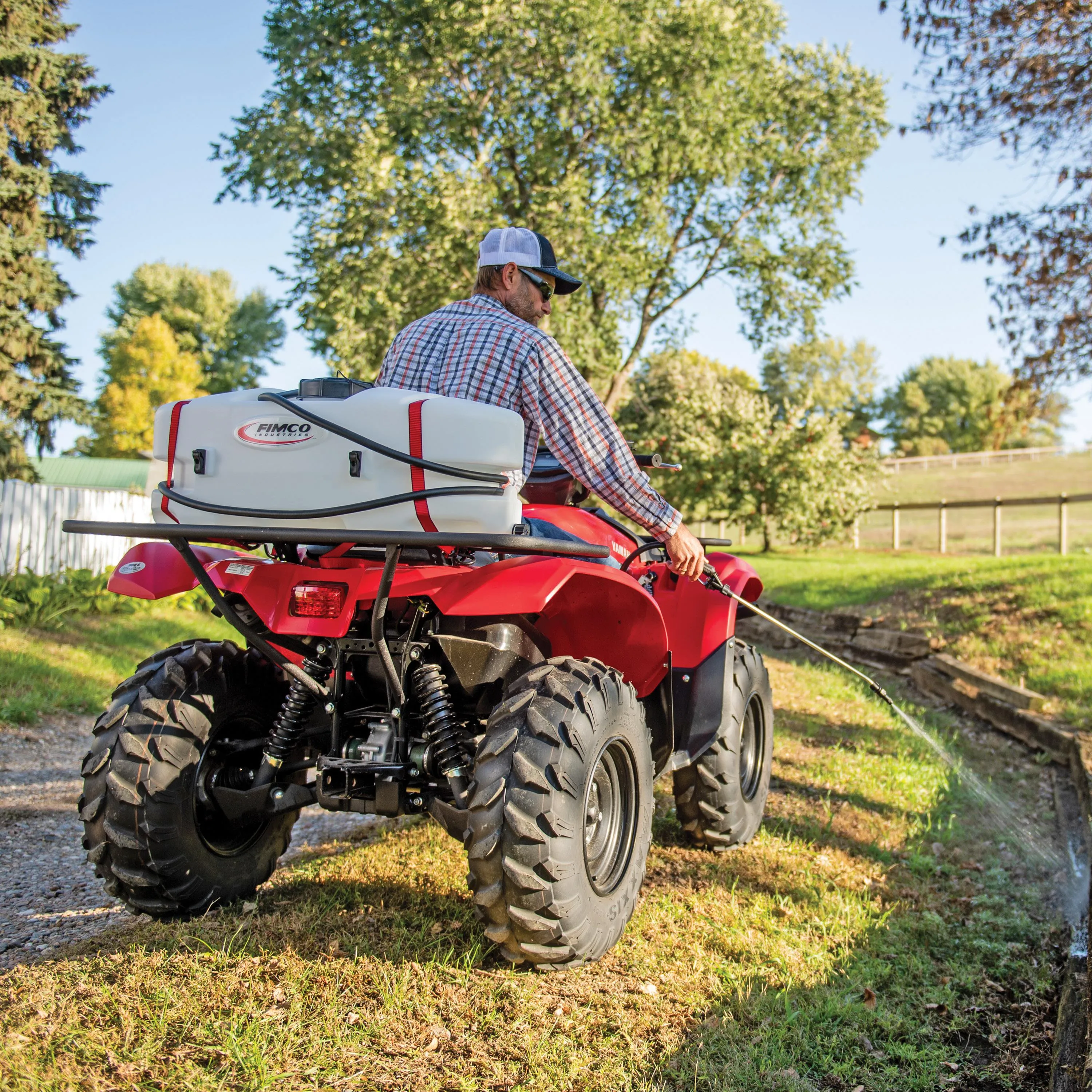 The FIMCO 57 Litre Standard Spot Sprayer is most widely used for weed and pest control. The UV resistant, 57 Litre molded polymer tank has a 5-inch tethered lid for easy access and is completely drainable for quick and effective clean out after spraying. This model lawn and garden sprayer features the fuse protected High Flo High Performance 12 Volt Diaphragm Pump that delivers up to 2.4 GPM and 60 PSI. The Lever Spray Wand features an adjustable spray pattern poly tip that can quickly adapt to your application needs and distributes up to 30 feet of horizontal spray, 16 feet of vertical spray and comes with 15 feet of 3/8 inch hose. Our FIMCO exclusive manifold places pressure control conveniently at your fingertips to fine tune your spray pattern. This sprayer sets the industry standard for small scale liquid applications. The best 57 Litre spot sprayer for controlling weeds, insects and diseases in bushes, hedges, small trees and infested spots in lawns, parks, industrial sites and pastures.