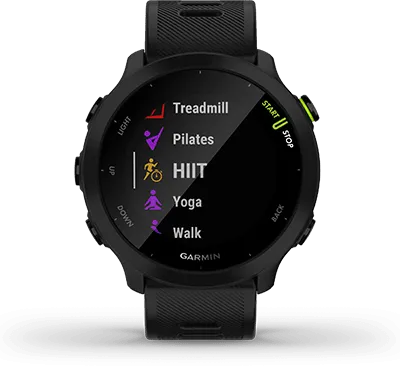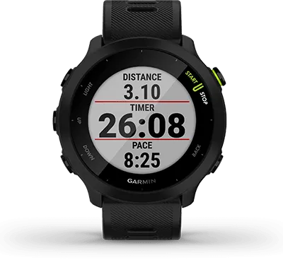 The Garmin Forerunner 55 is an easy-to-use GPS smartwatch perfect for runners of all skill levels. With up to 2 weeks of battery life, it tracks your runs, heart rate, and fitness goals while offering advanced features like Garmin Coach, PacePro™, and recovery insights. Its lightweight design and preloaded sports apps make it a great companion for fitness and everyday life.