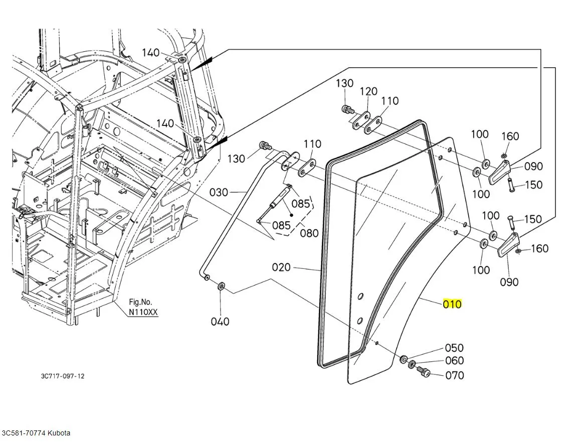 The Kubota 3C581-70774 Left Door Glass is designed for cab-equipped M-Series tractors, providing a secure, clear, and durable replacement for damaged or worn-out door glass. Made from high-strength, shatter-resistant glass, this OEM part offers excellent visibility and weather resistance. The precision-fit design ensures easy installation while maintaining the tractor’s structural integrity and cabin protection.