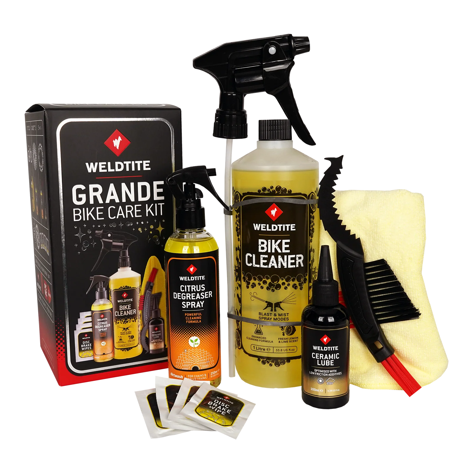 The go to bike care kit. The big one! The Grande Bike Care Kit includes Weldtite cleaning products for the frame, cassette and chain plus Ceramic Lube to enhance drivetrain performance and lifespan.