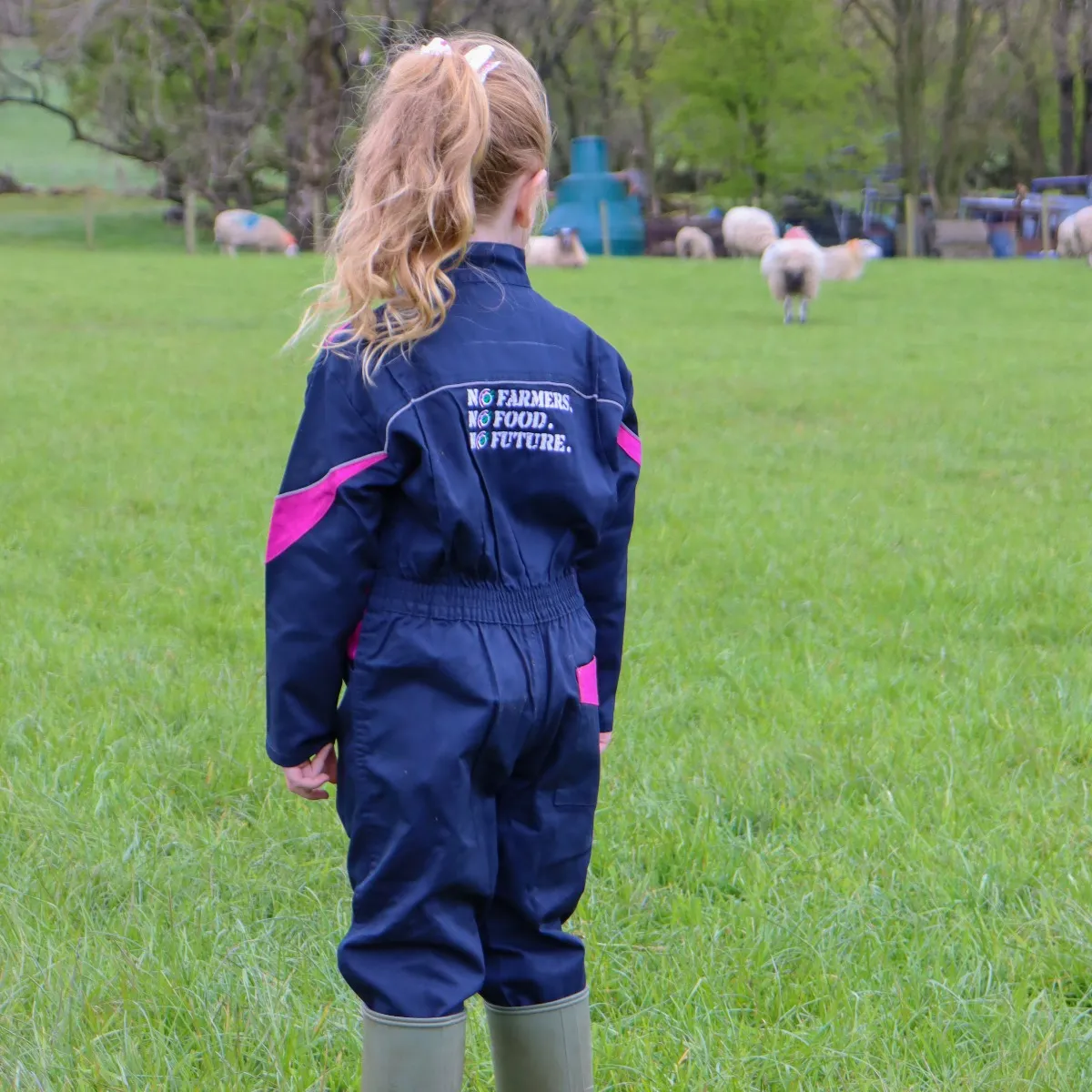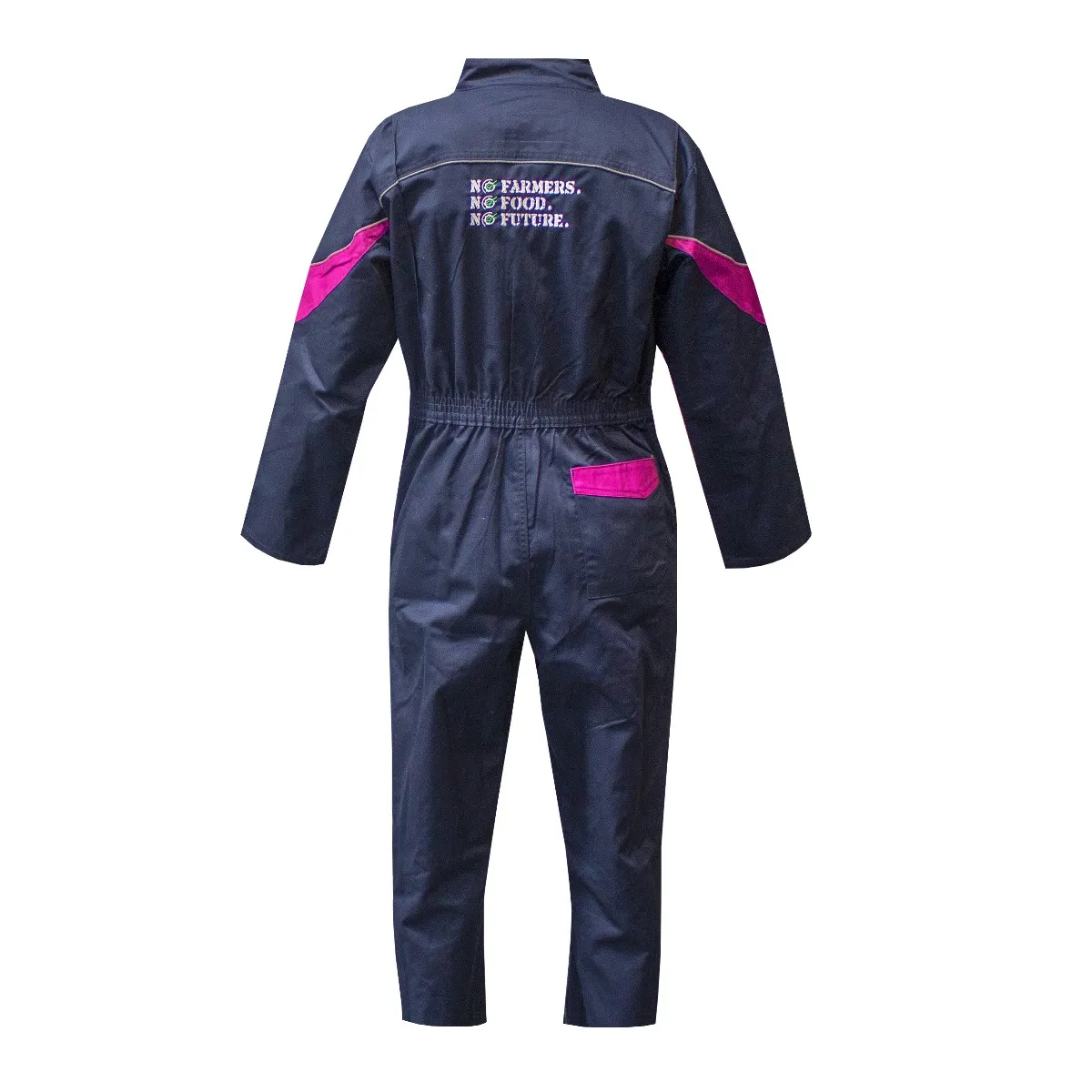 NEW kids coverall in a two-toned grey & pink! Complete with our NO FARMERS. NO FOOD. NO FUTURE. logo to the back and a NEW design GRASSMEN logo to the front. The coverall is complete with a high collar, 2 chest pockets, 2 pockets at waist height, 1 back pocket, pleated back and elastic waist. The coverall is also complete with reflective piping on the cuffs and back. The dual zipper allows for easy step in and step out.