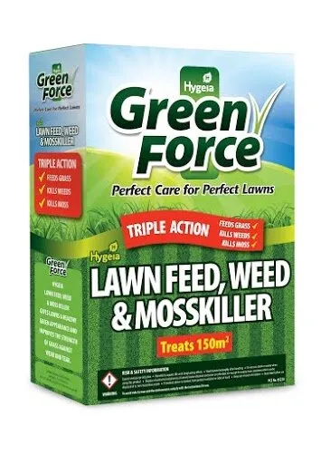 Hygeia Lawn Feed, Weed and Mosskiller feeds the grass, kills weeds and moss all in one step. This product is the best value on the market as it has the most coverage per weight.