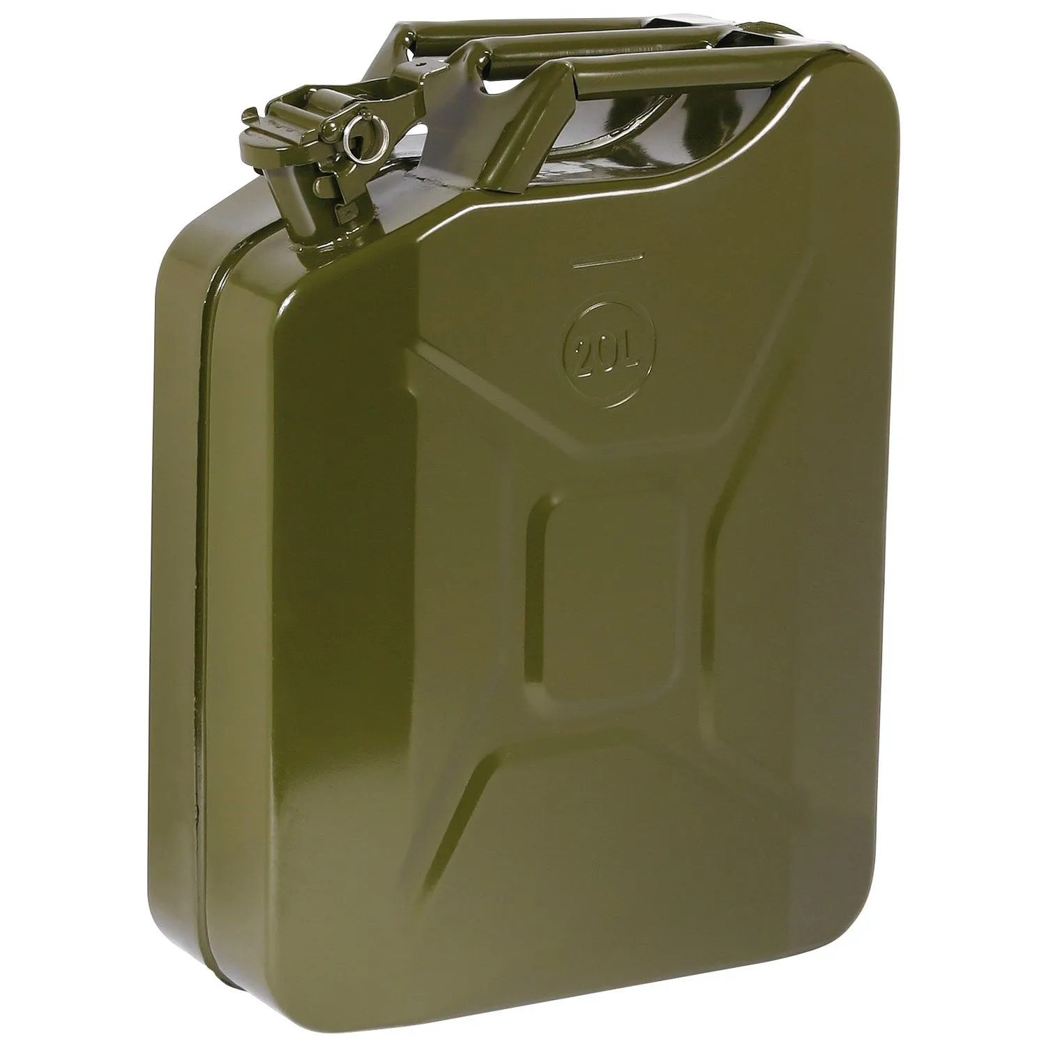 The SIP 20ltr Green Steel Fuel Can serves as a safe method of transporting fuels, water, and oil, achieved via a secure locking pin on the cap of the can which ensures the fuel is kept enclosed, reducing the risk of spillage and contamination.