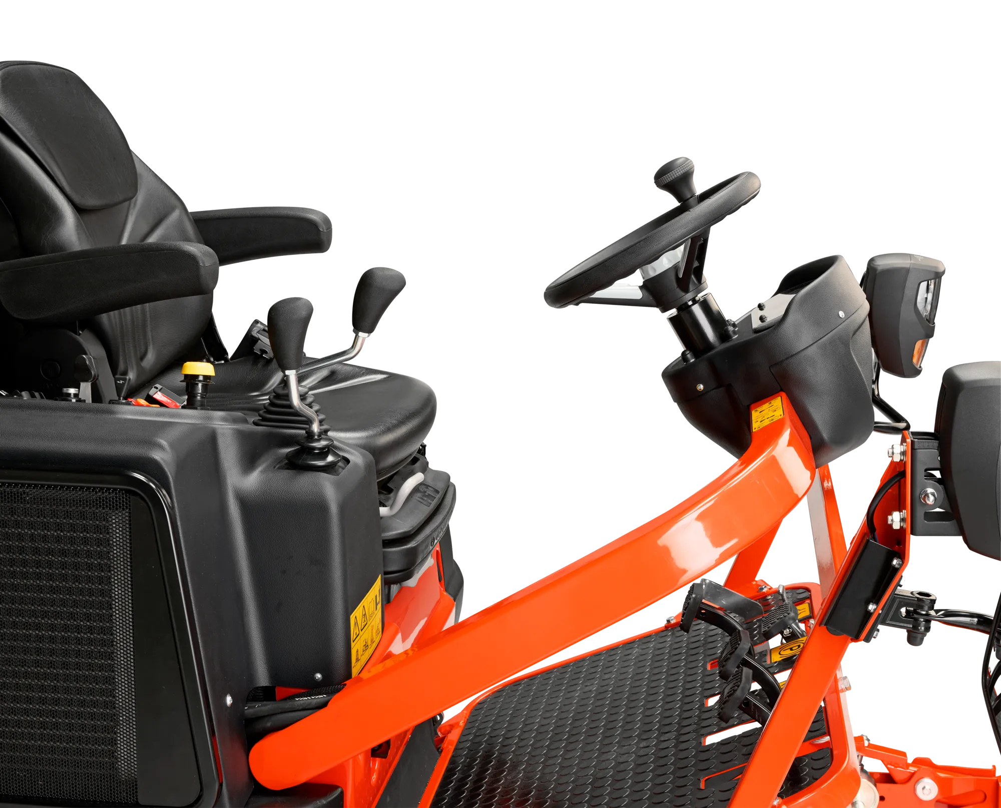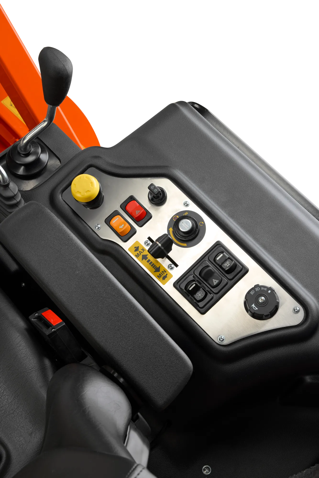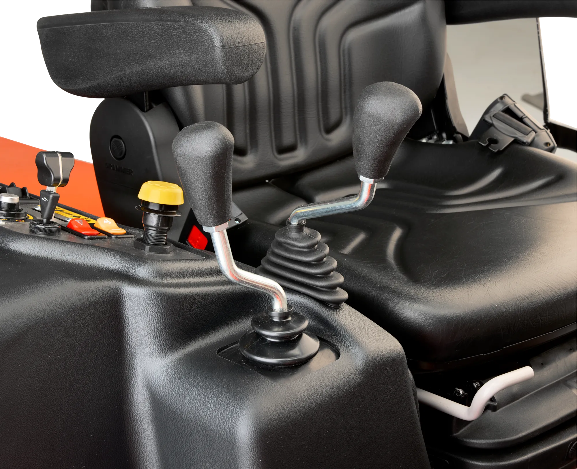 Suspension seat with armrest and an expansive tilting platform improves visibility and reduces fatigue over extended period. LED lights and ergonomic levers make your work easier even during low light operations.
