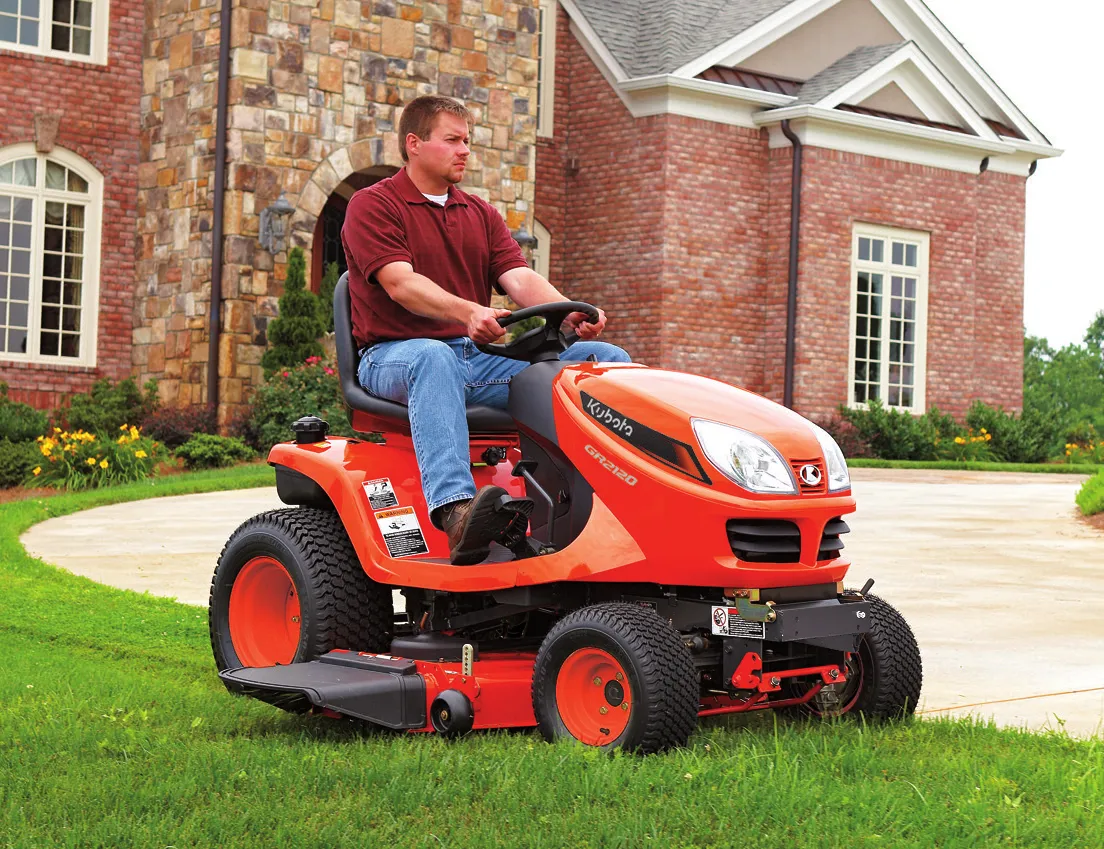 Powerful and robust versatile mower - Kubota GR2120S Ride-On Lawnmower. Kubota GR2120S features 21hp diesel powered mower, easy to operate, fitted with all-wheel drive hydrostatic transmission. Suitable for large home and small estate users. The key feature of GR2120S is the unique Kubota Glide Steer system. It enables you to drive around an obstacles such as tree with extremely tight turning circle, allowing a single cut pass without worrying of the wheels scuffing the turf.