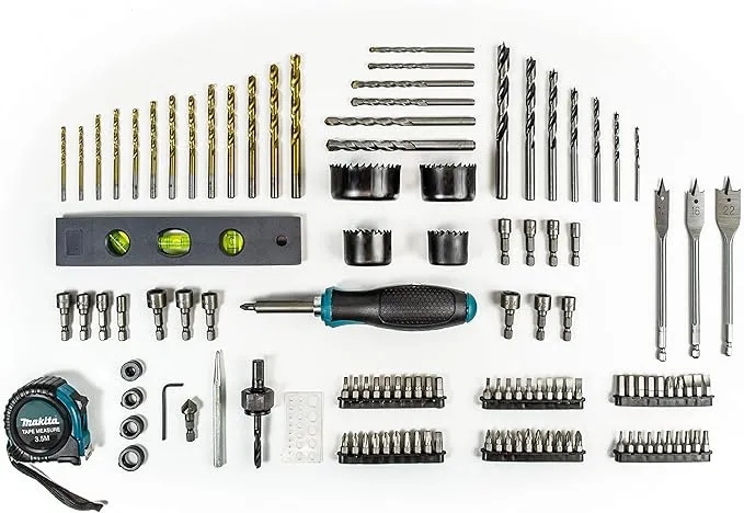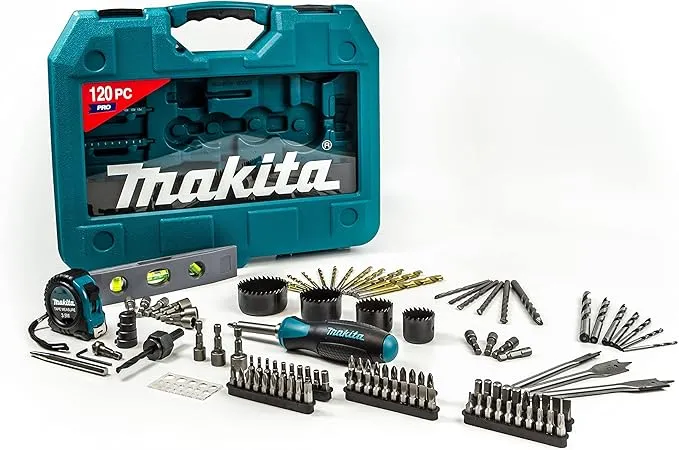 The Makita P-90370 120 Piece Drill and Bit PRO Accessory Set is an extensive accessory kit designed to handle a wide variety of tasks for professionals and DIY enthusiasts alike. Featuring 120 pieces, this set includes screwdriver bits, brad point bits, masonry drills, high-speed steel (HSS) bits, nutdrivers, holesaws, and more, making it an all-in-one solution for your drilling and driving needs.